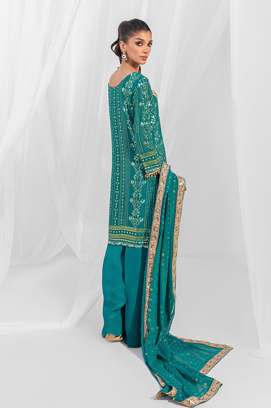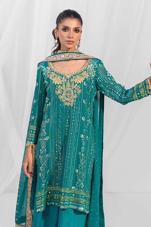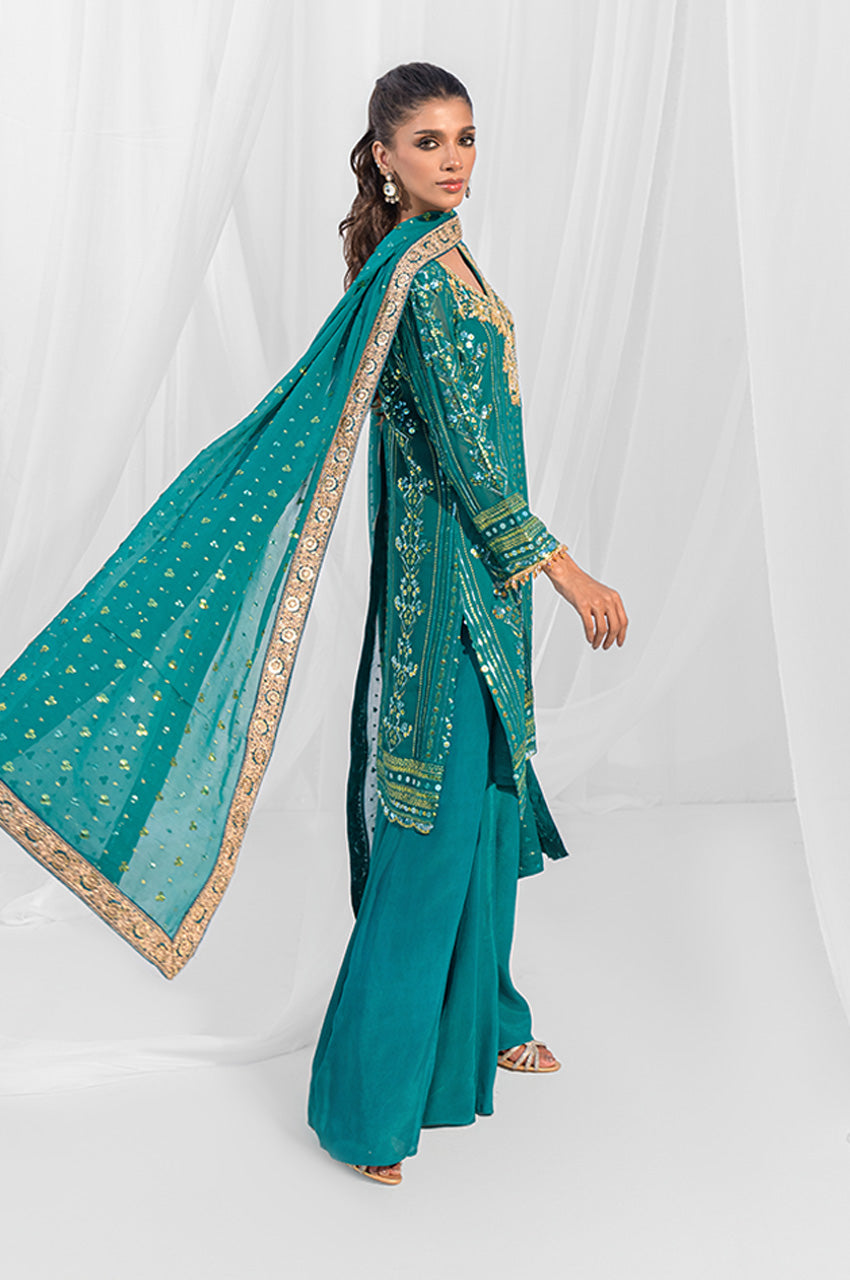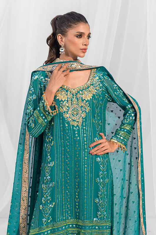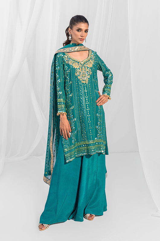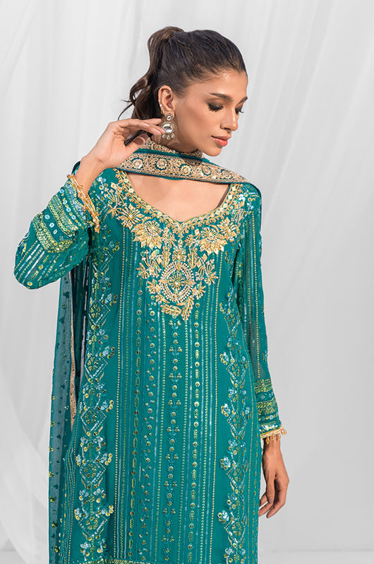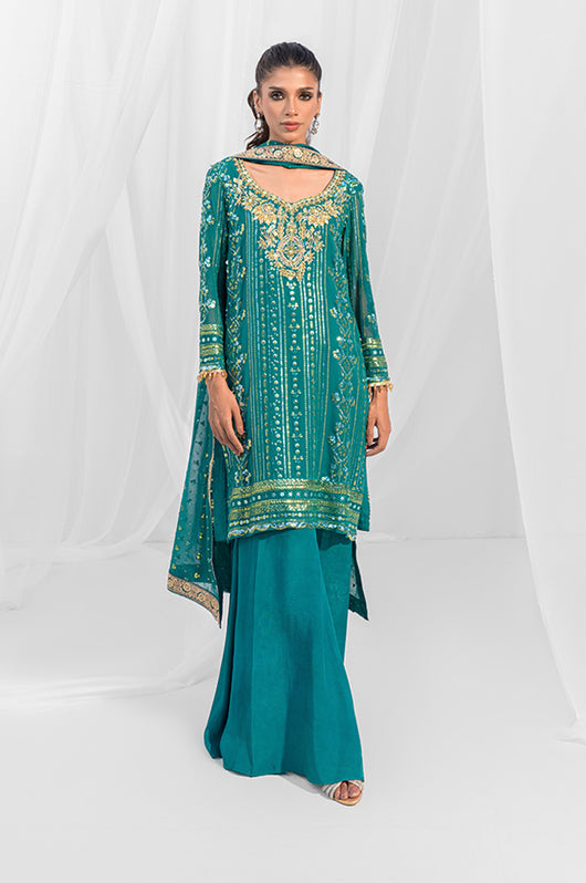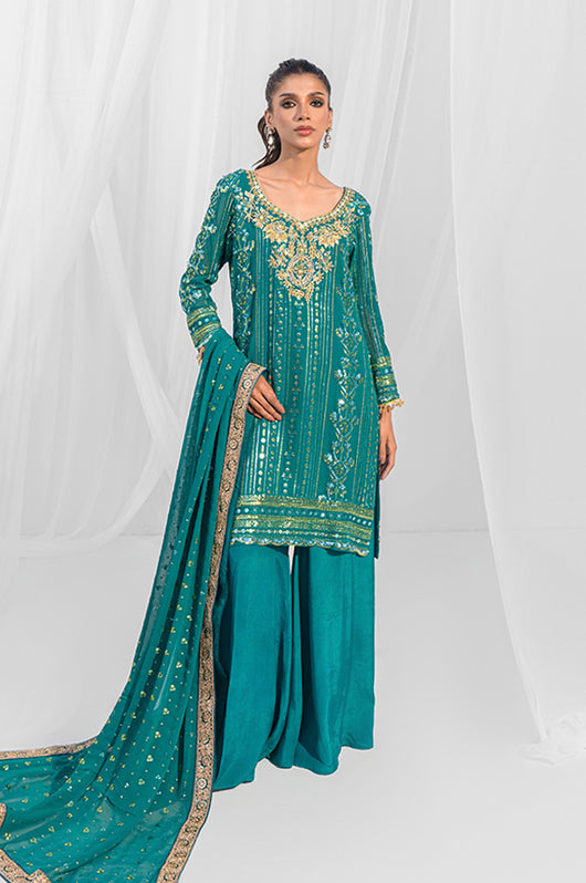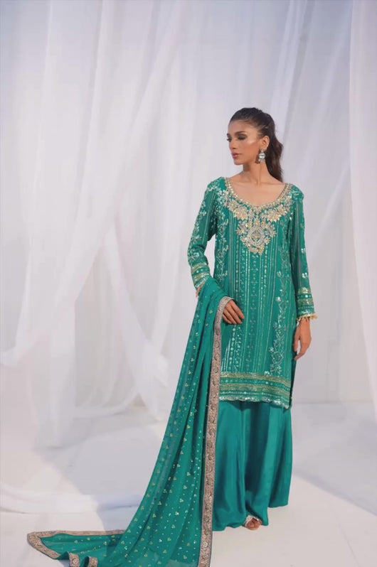 Sudah is a beautiful emerald green embellished in gold and green sitaray all over. The dress is made in pure georgette chiffon. The neckline is heavily embellished and sleeves has champagne colored beeds and crystals stitched underneath the hem. The dress comes with flarred pants and a green dupatta with lace finishes. Length of the shirt is 38 inches and can be customised according to your requirements. Please mention in additional notes section when placing the order.