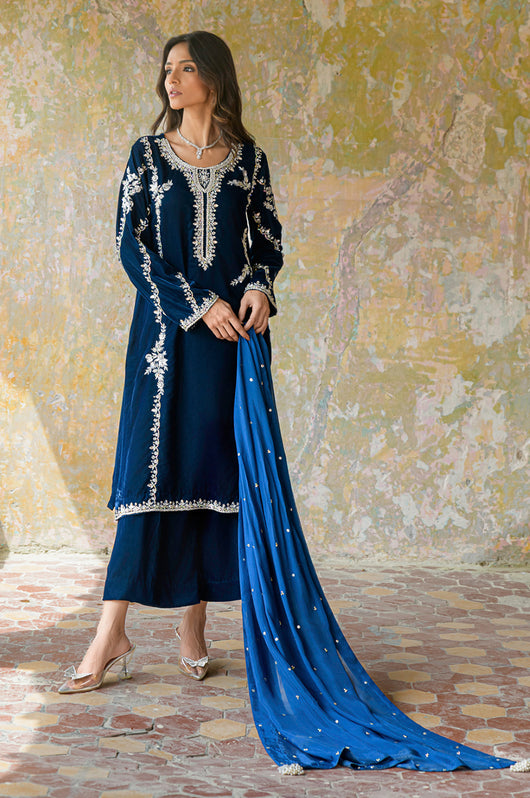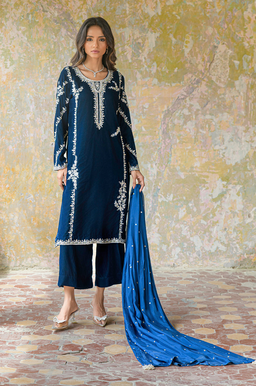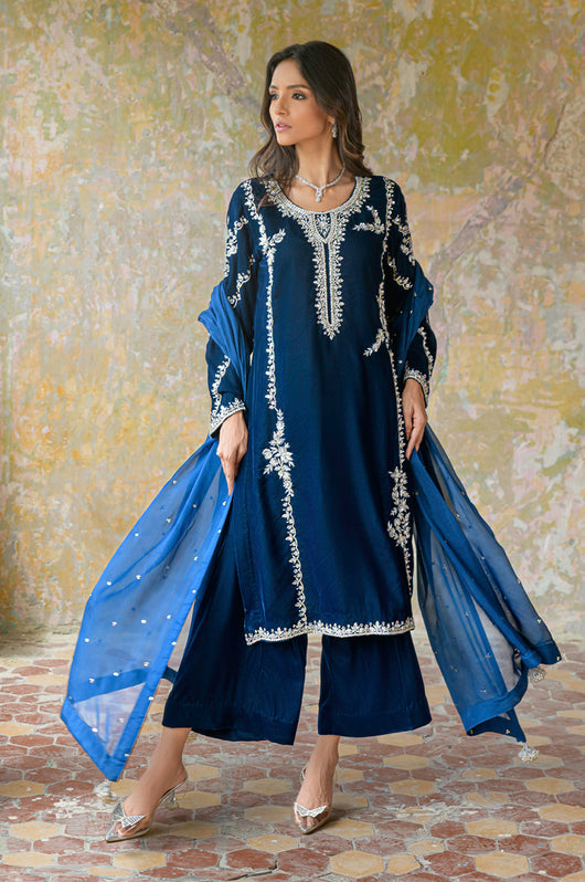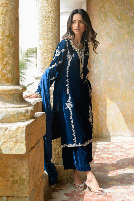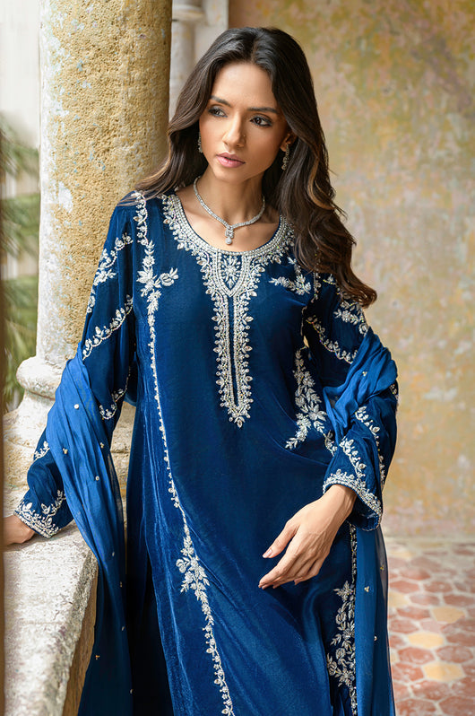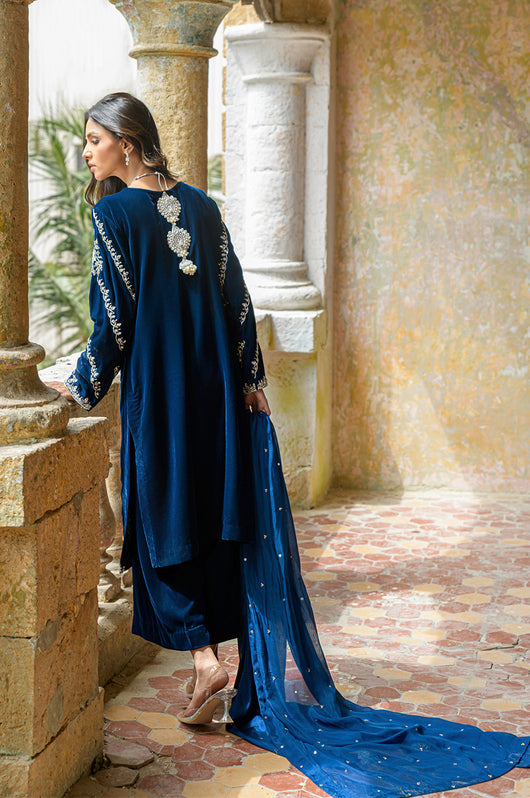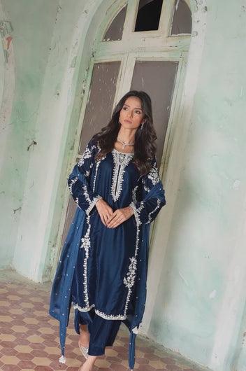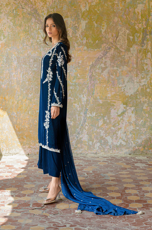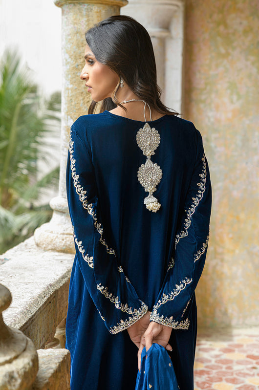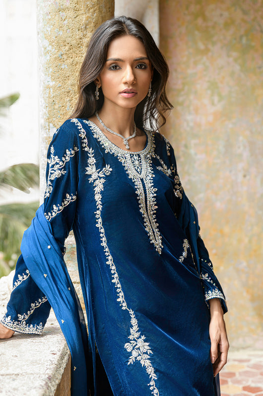 Syrel is a teal blue dress made in velvet, with hand embellished in silver work all over the front and motifs on back. The dress comes with same pants and silk dupatta with heavily embellished chan and tass details. Length of shirt is 40 inches and can be customised mention in the additional notes section when placing the order.