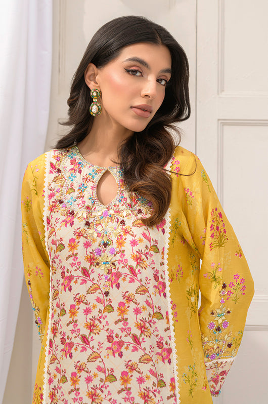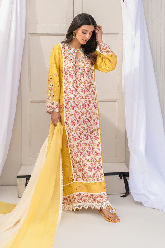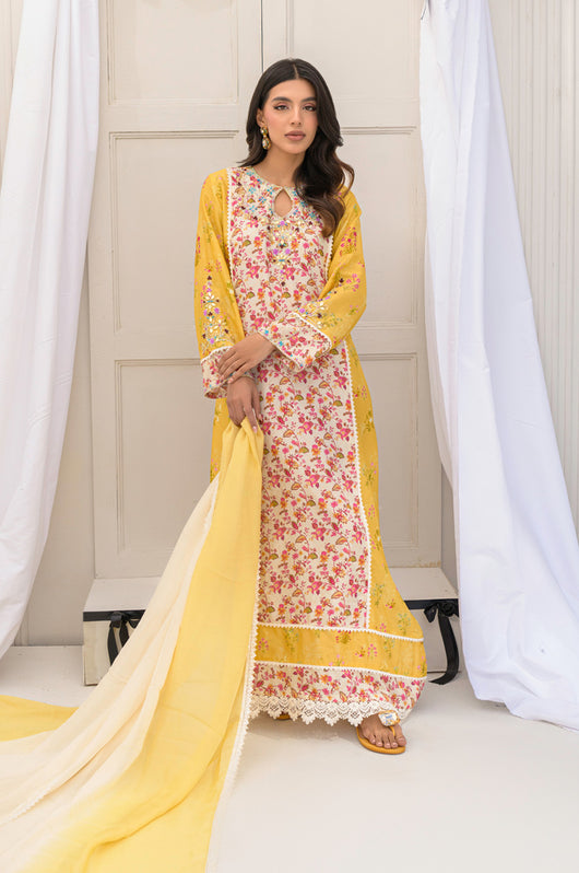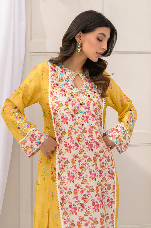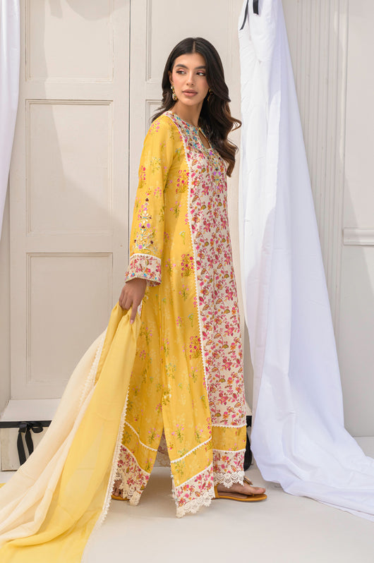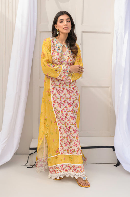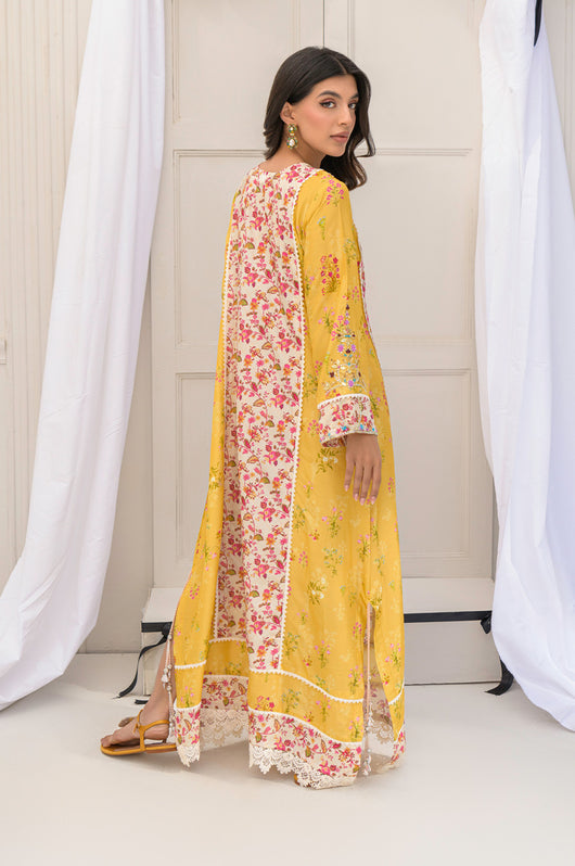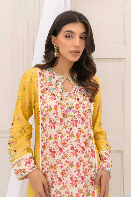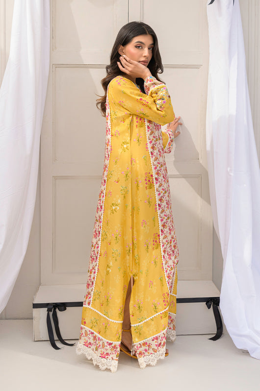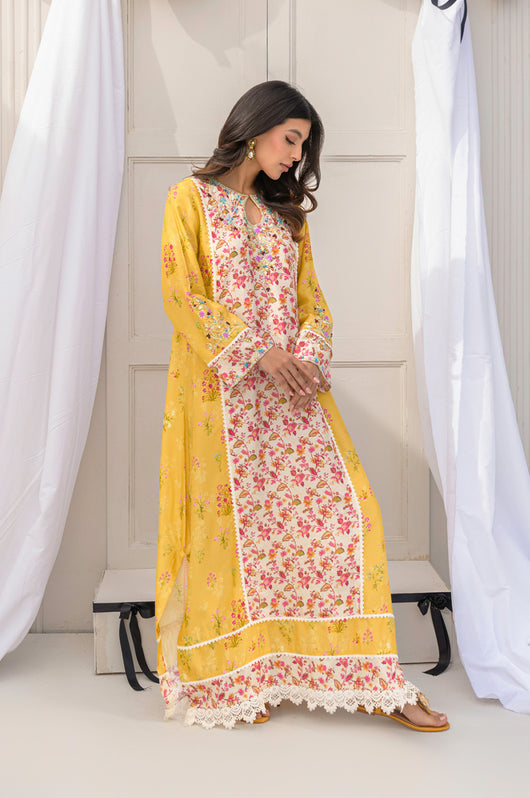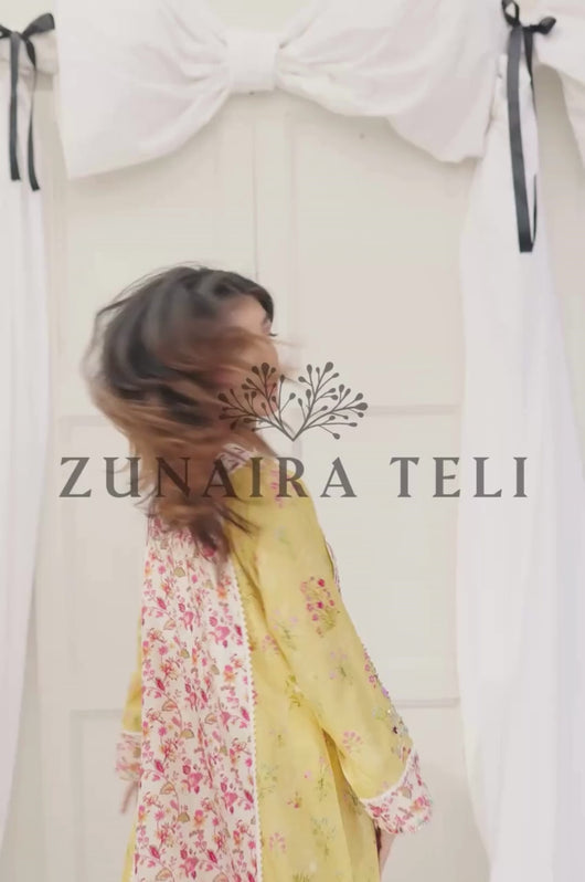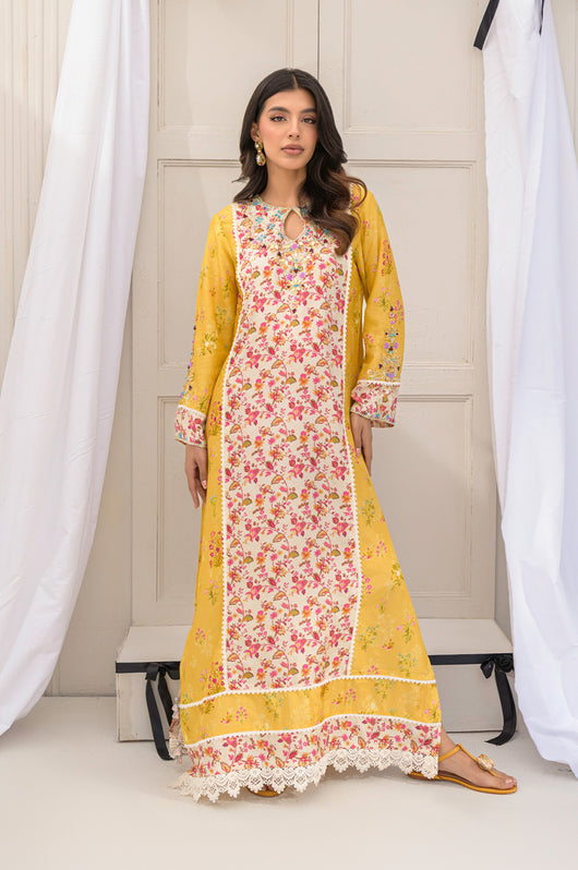Tahi is a printed long kaftan with a symphony of bold prints combined with lace finishes. The outfit comes with multi colored material details on neckline and sleeves. Tassels im the chak to complete the look.