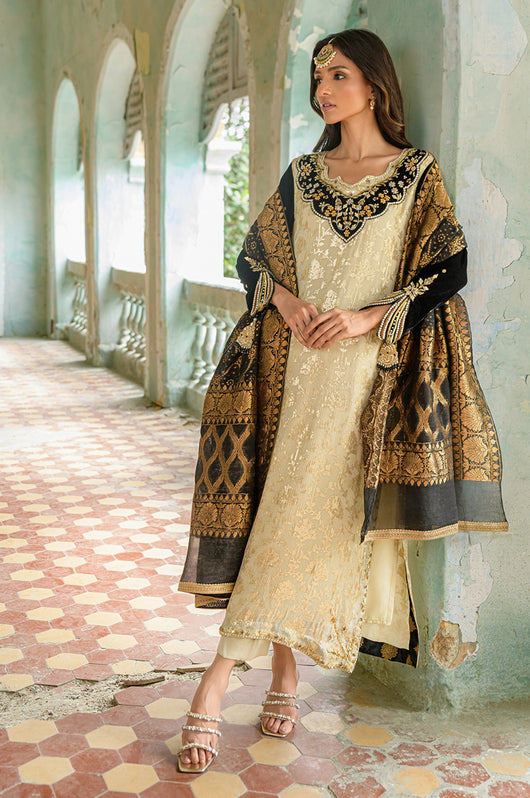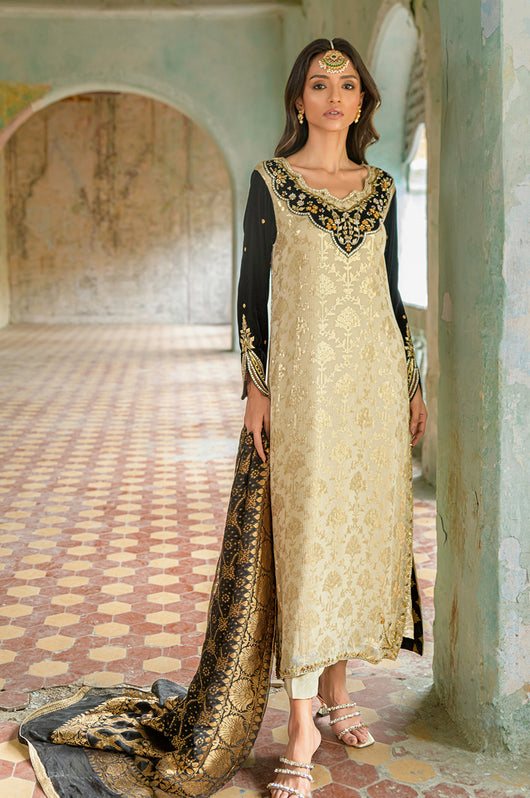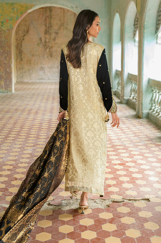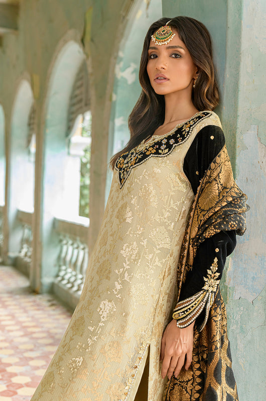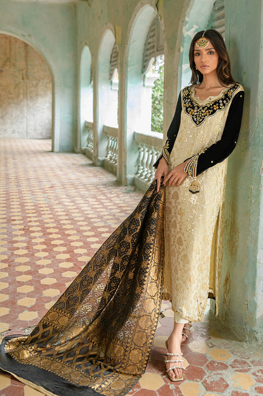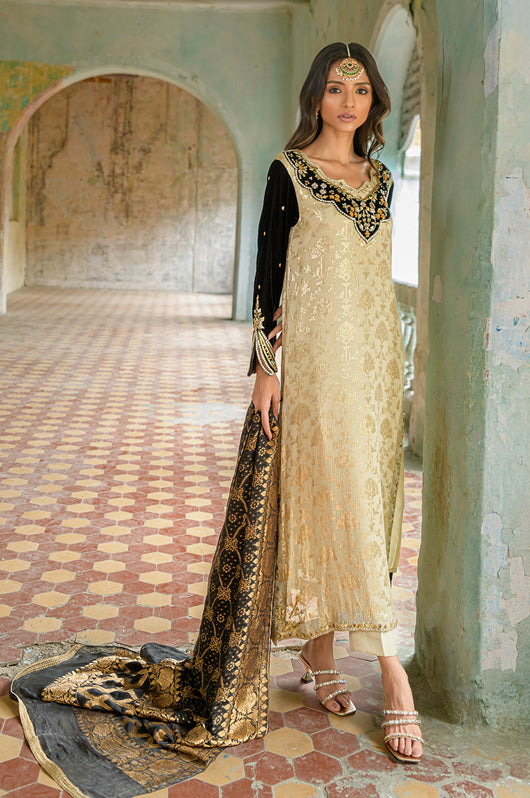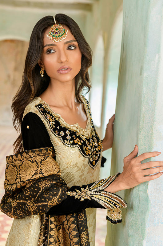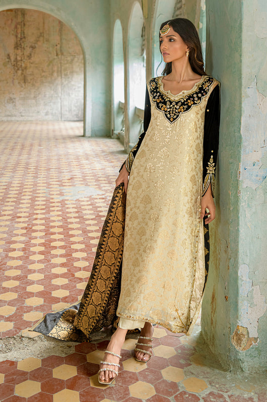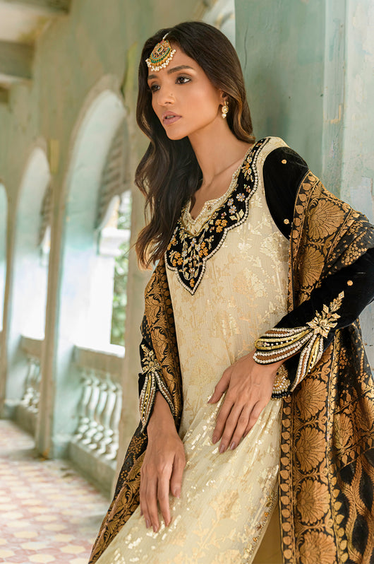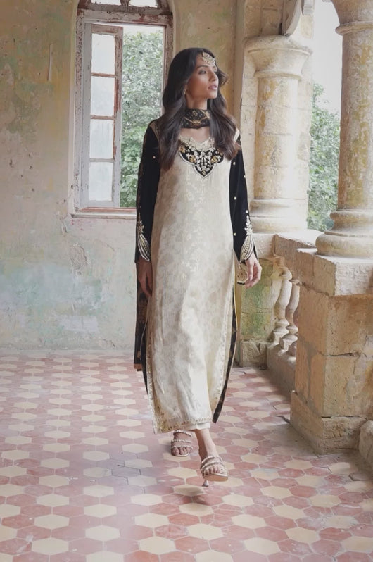 Tamaya is a shirt made in sequinned fabric with a baroque style pattern, with sleeves made in velvet. The shirt is hand embellished by adding appliqués on the neckline and hand work done all throughout the chak and daman of the shirt. The dress comes with heavily embellished sleeves with tassel details and same creme colored pants. With a black dupatta made in banarsi chiffon and lace details around it. Length of the shirt is 49 inches, for custom length please mention in additional notes when placing the order.