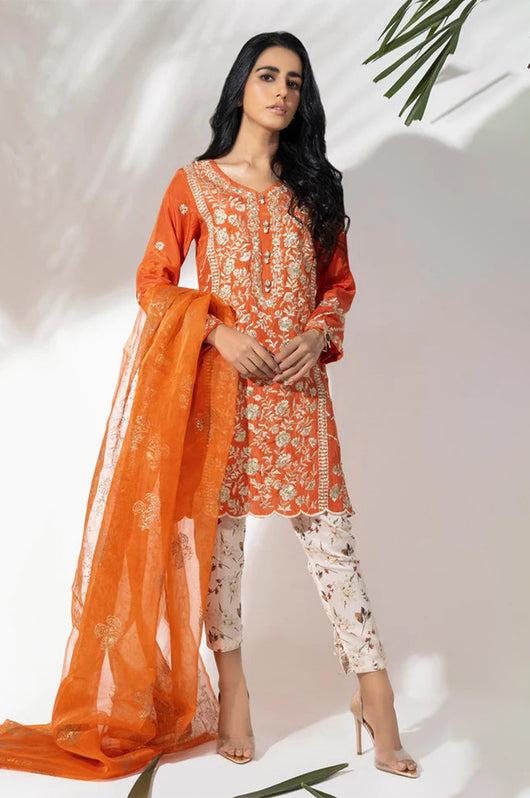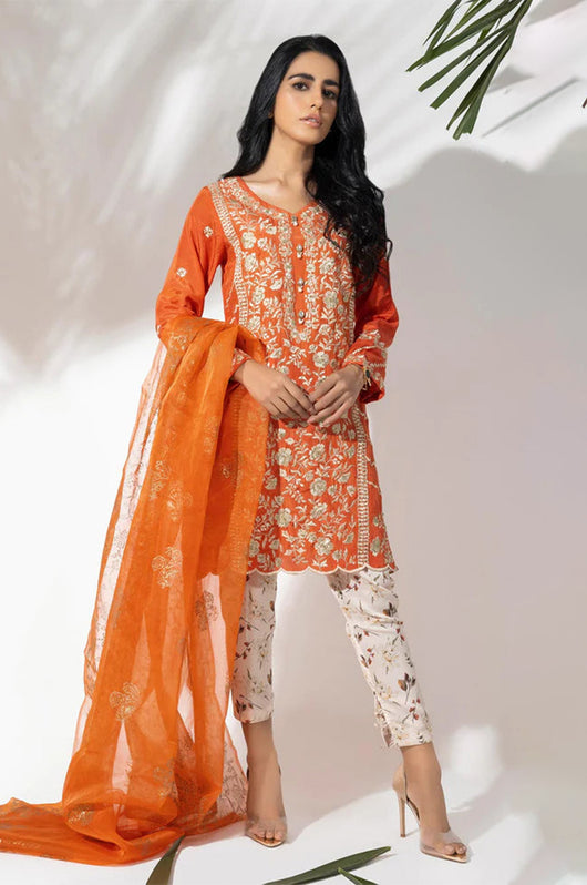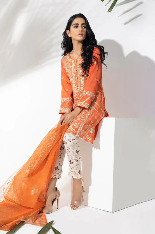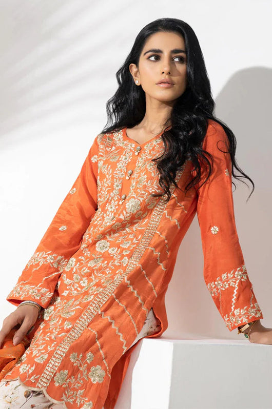 This embroidered shirt with sequence touching comes with printed crepe silk khadi shalwar or trousers and is paired with an organza dupatta with gold block printed borders and pattern all over the dupatta.