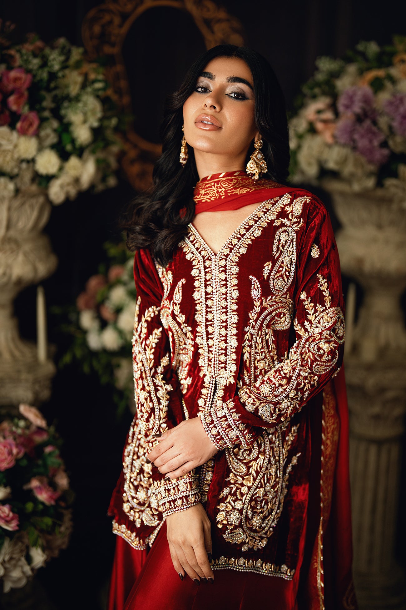 The model is wearing a luxurious traditional outfit crafted from deep maroon pure French velvet, giving it a rich and regal appearance. The kameez features intricate, heavy dull gold and silver embroidery throughout—especially dense along the neckline, sleeves, and front panels. The embroidery includes ornate paisley and floral motifs, highlighted with shimmering embellishments that catch the light beautifully.