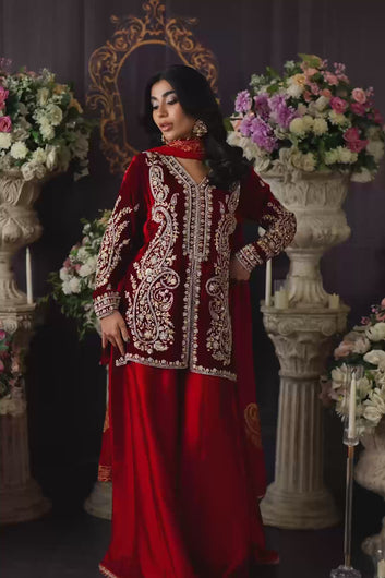 She pairs the kameez with wide-legged trousers in a matching deep red tone, made from pure sheesha silk fabric that complements the heavier velvet top. The hem of the trousers is lightly adorned with delicate detailing that ties the whole look together.