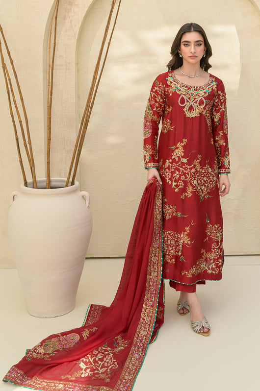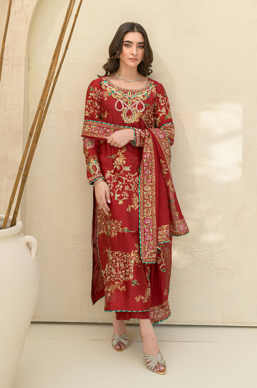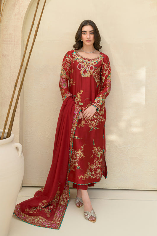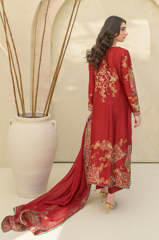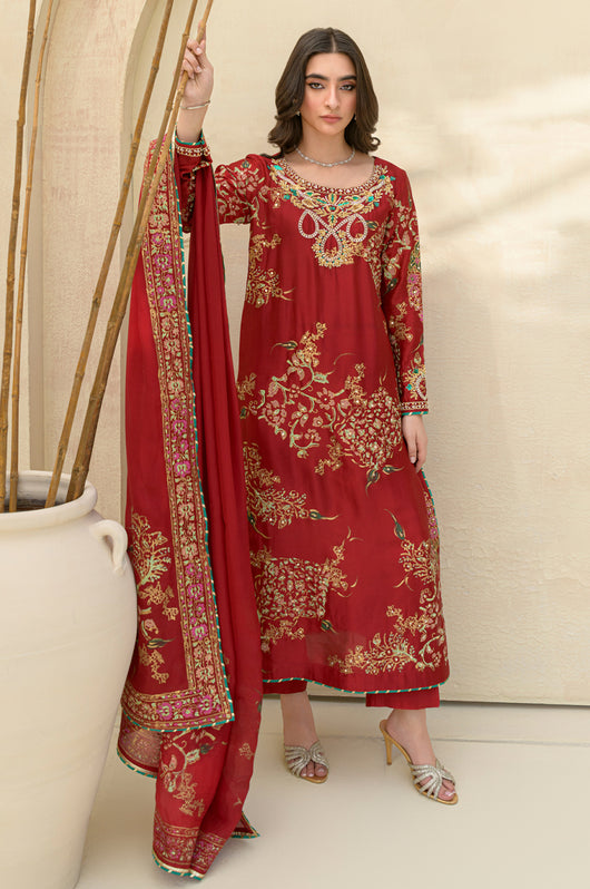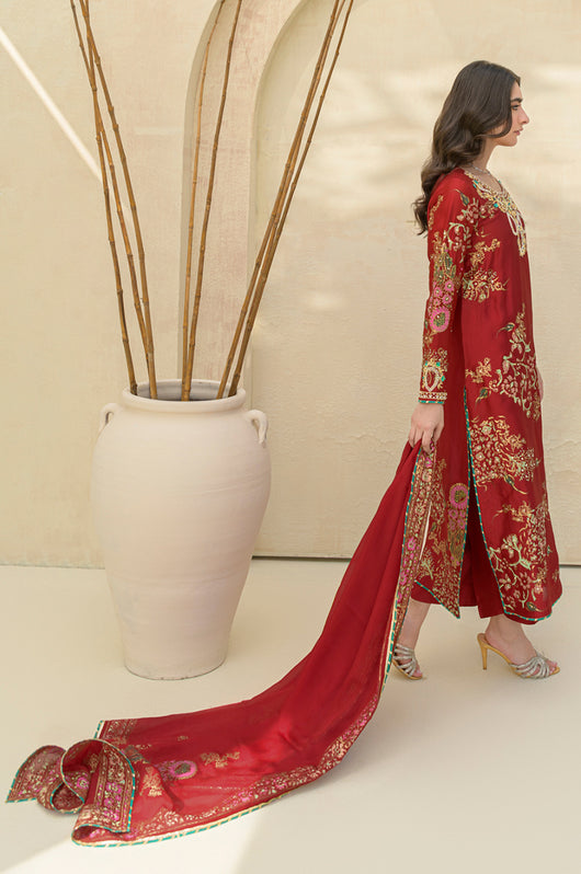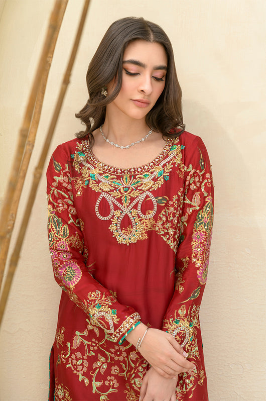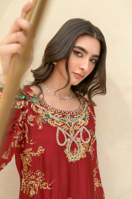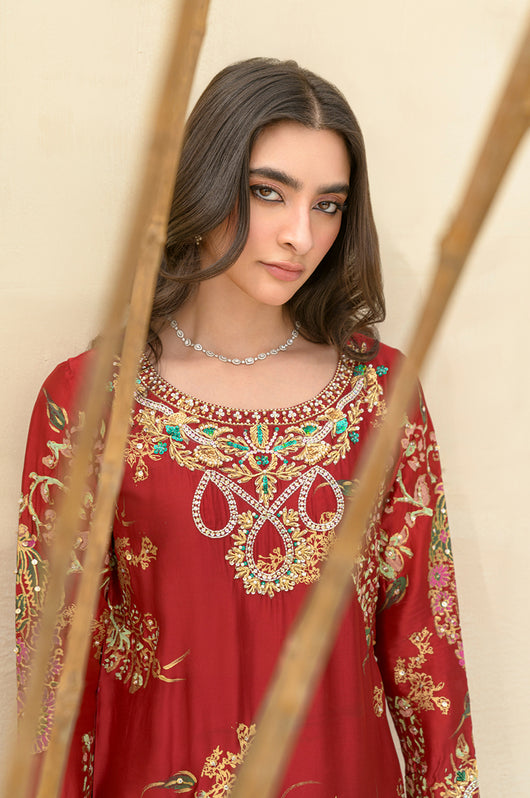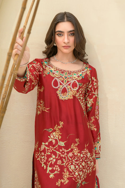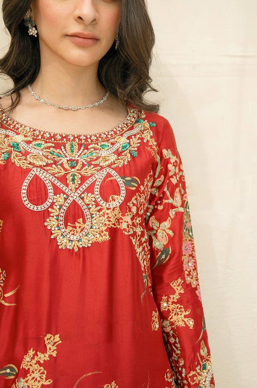 A stunning deep red Rose colored long shirt in a seesha silk silhouette, adorned with exquisite floral blocked print and intricate hand embellishments all throughout. This elegant piece features heavily embellished neckline and sparkling embellishments all over the shirt. It is complemented by a striking rose colored silk dupatta with hand block printed detailing as well. This outfit is paired with straight pants available in the same color.