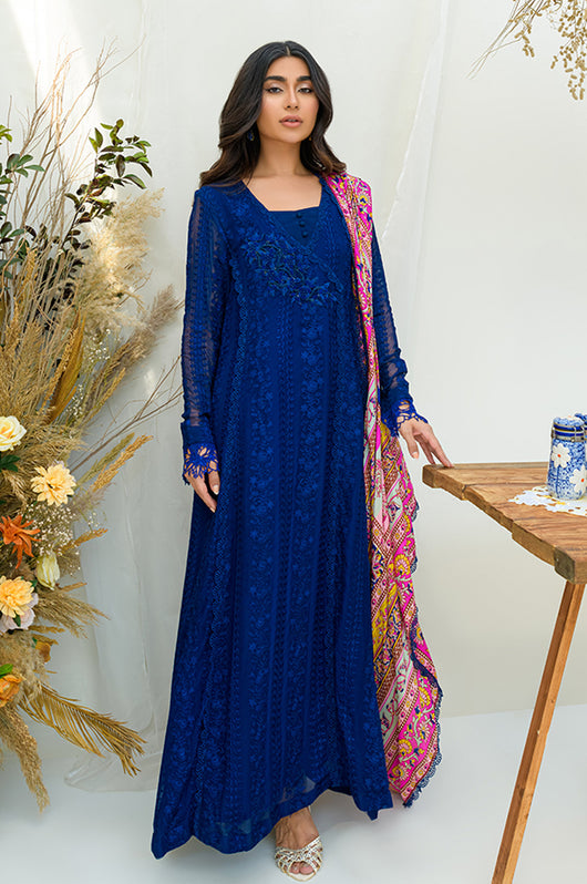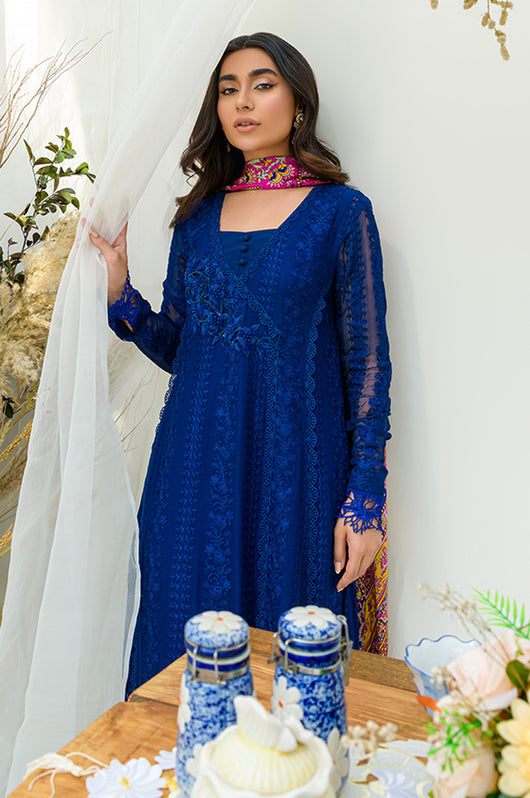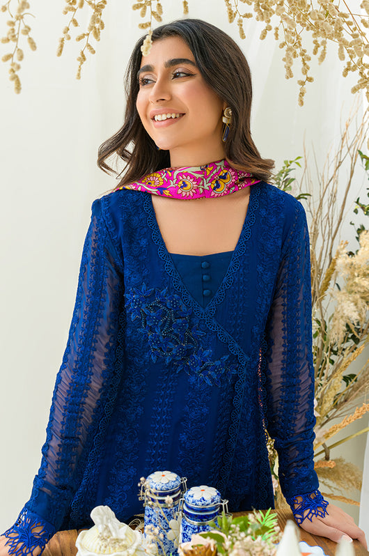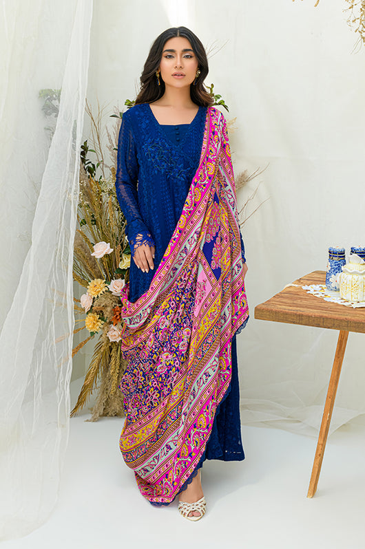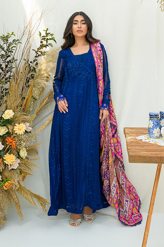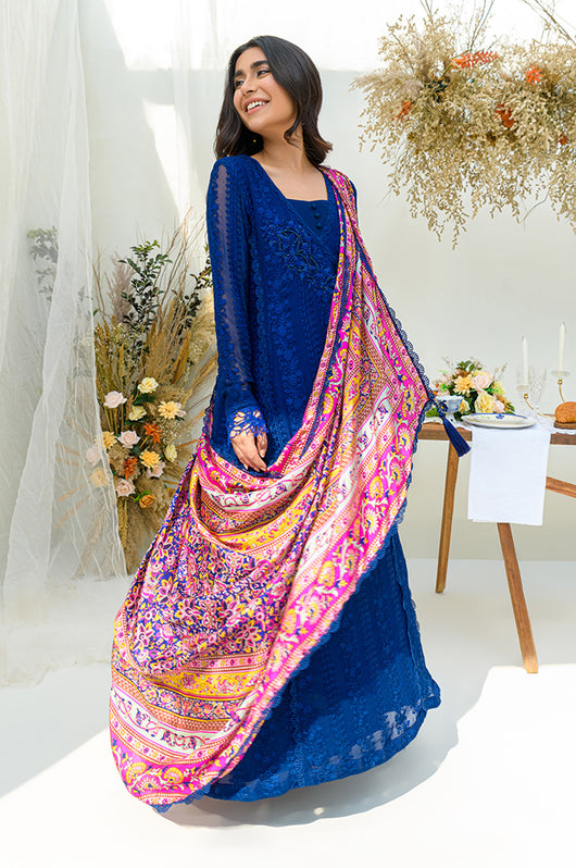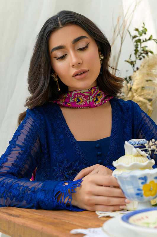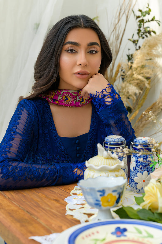 Tara is a charr blue embroidered dress with lace details and handwork on the neckline. The dress comes with silk plain straight pants and a digital printed dupatta with lace and tassel finishes.