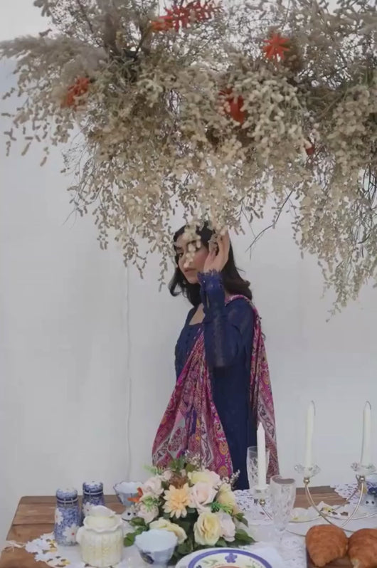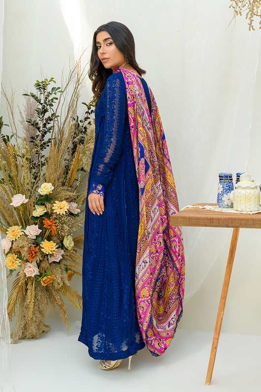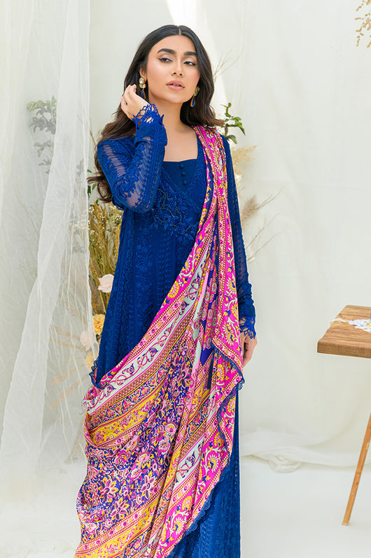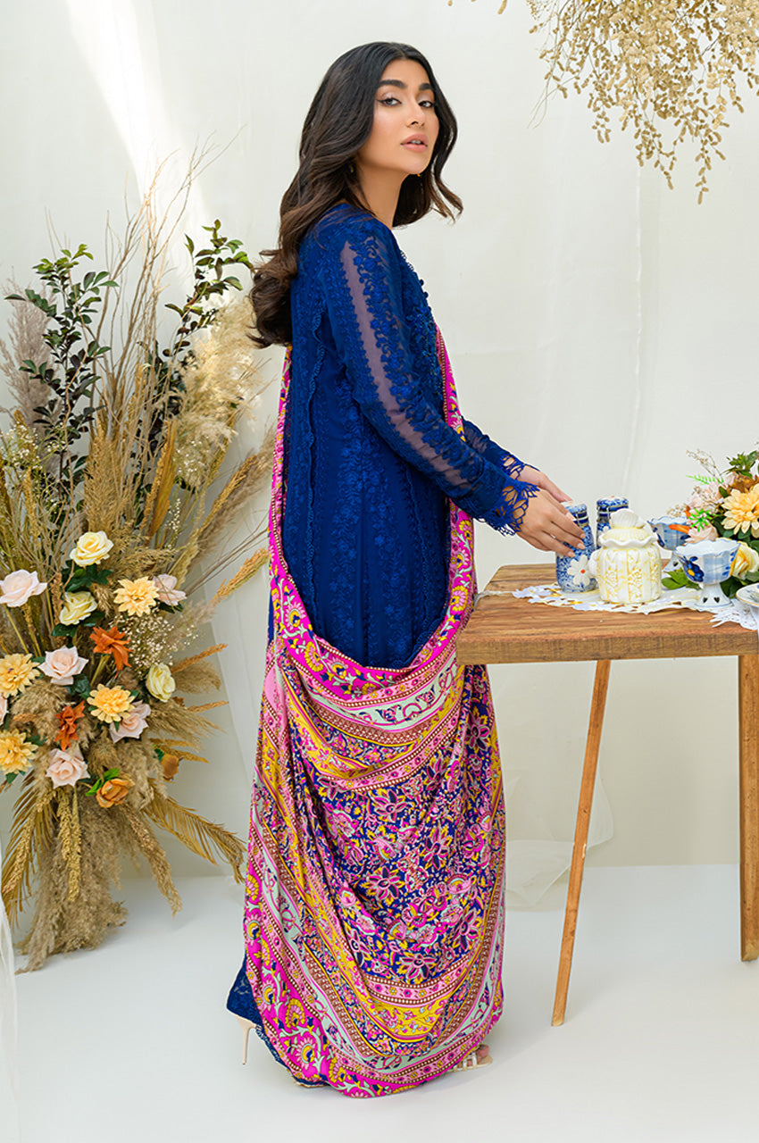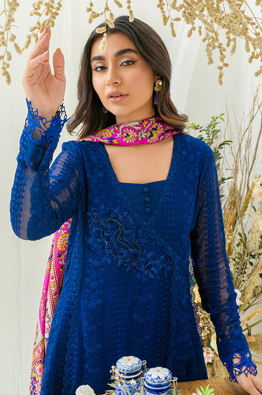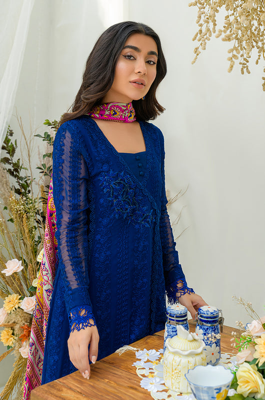 Tara is a charr blue embroidered dress with lace details and handwork on the neckline. The dress comes with silk plain straight pants and a digital printed dupatta with lace and tassel finishes.