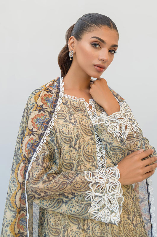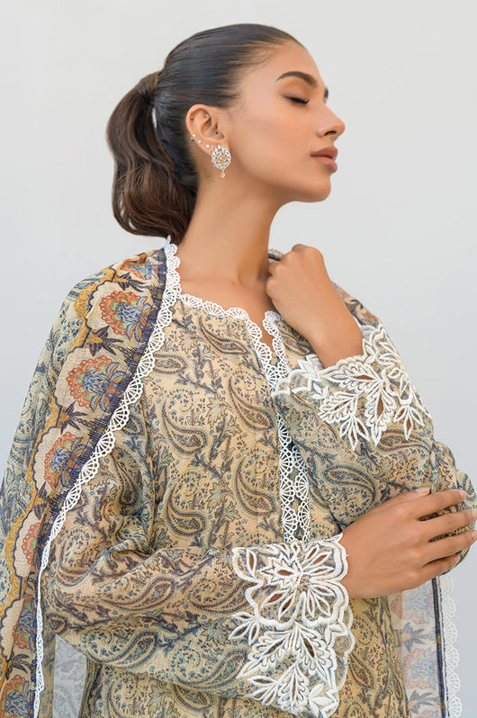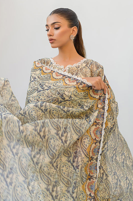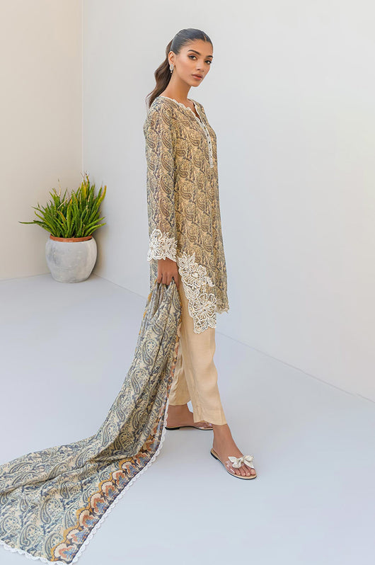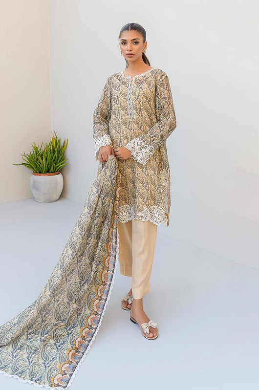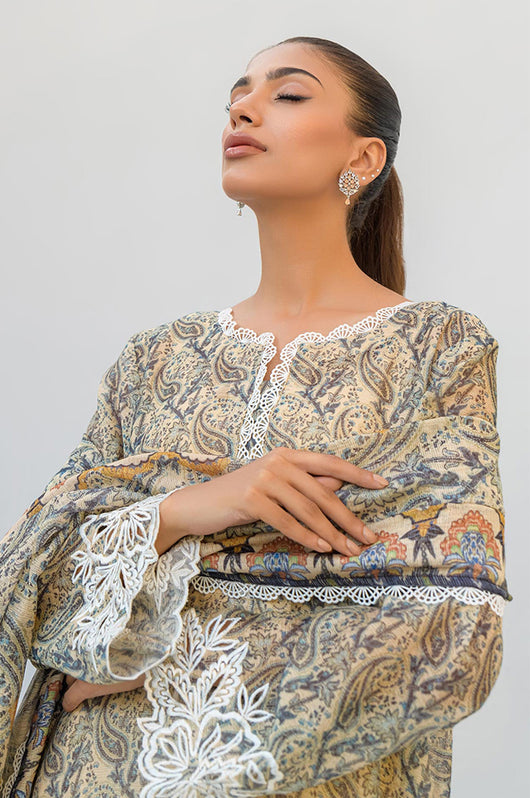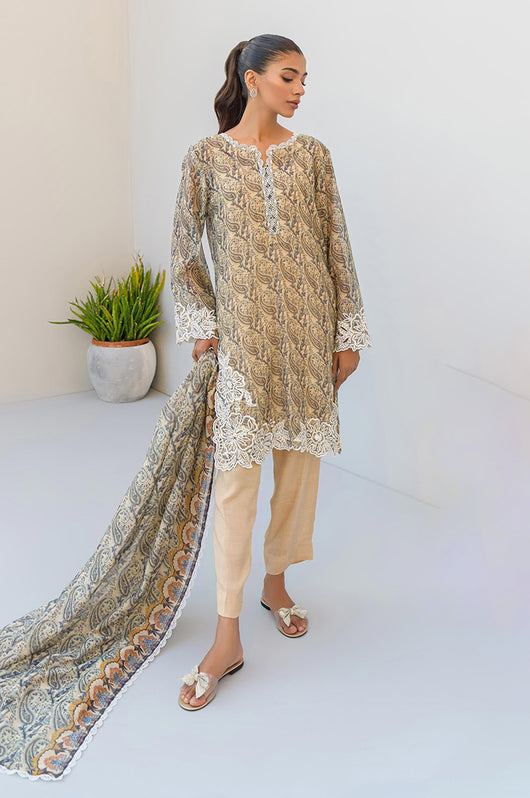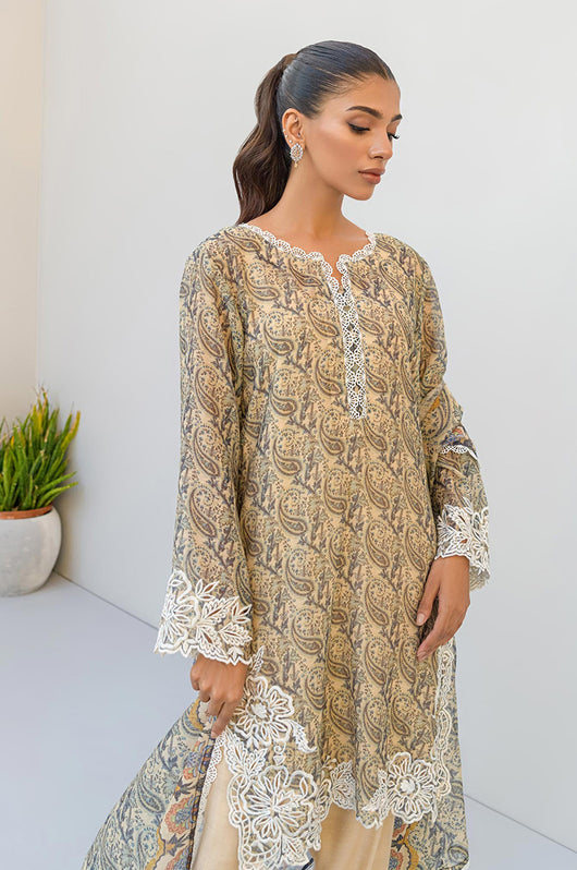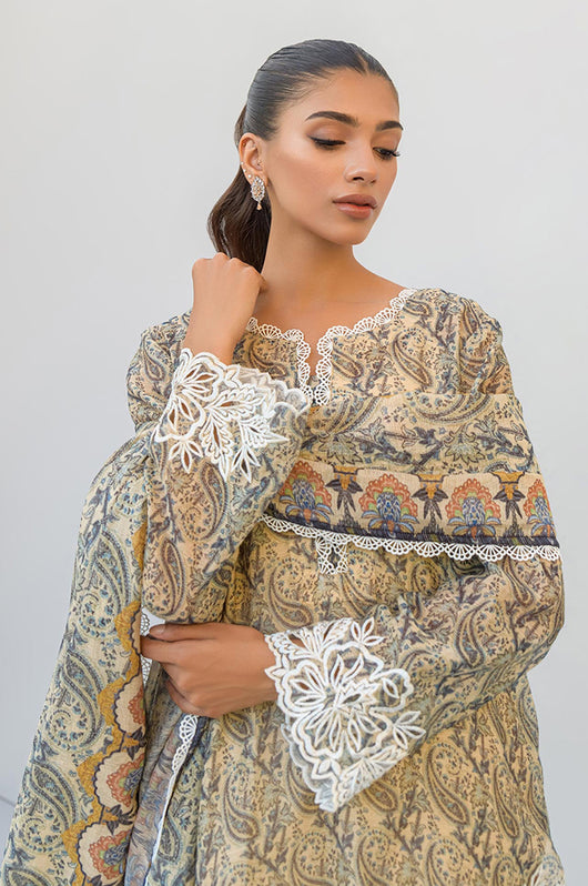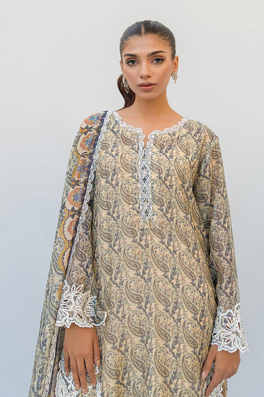 Tasha is a beige and dark blue colored shirt made in cotton net with white cut work and embossed flowers all over with a round daman and lace finishes on the neckline. The dress comes with plain beige silk pants and a cotton net dupatta with lace finishes.