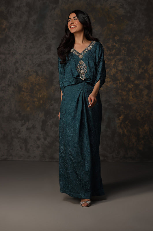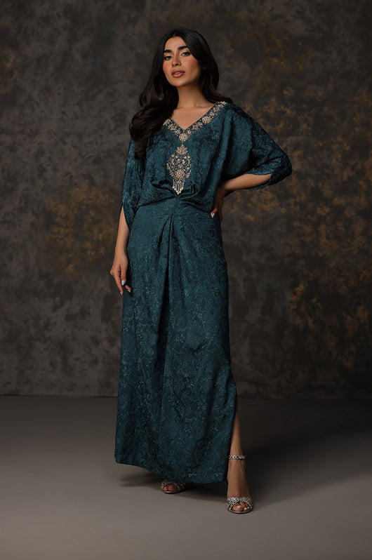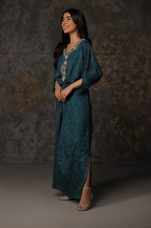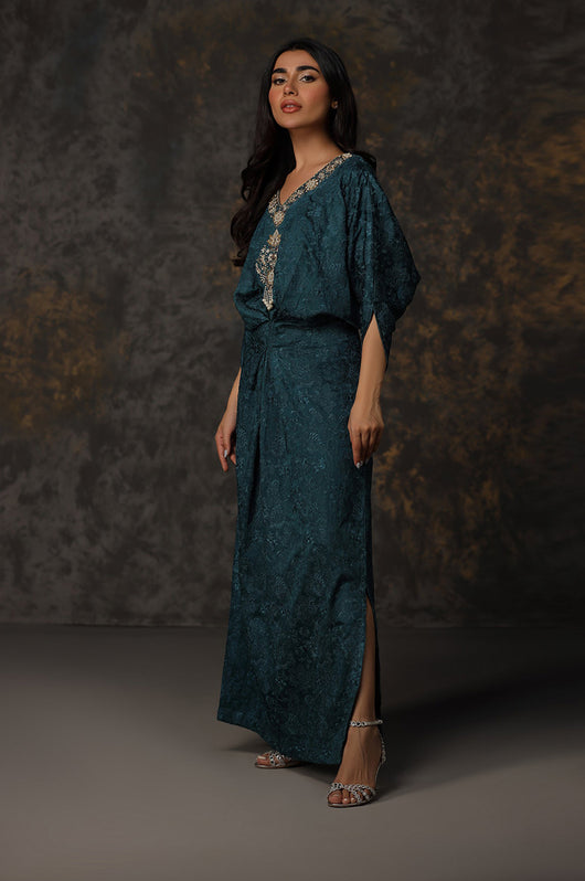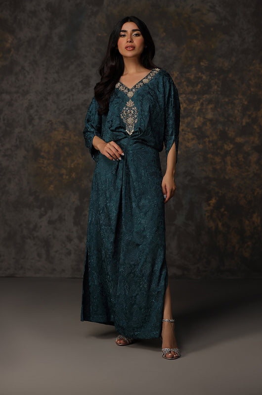 This self-embroidered kaftan comes with a detailed embellished neck and tussles detailed to finish the look. Kaftans are statement pieces for any wardrobe and a pop of color with the modernity always adds to the final look.