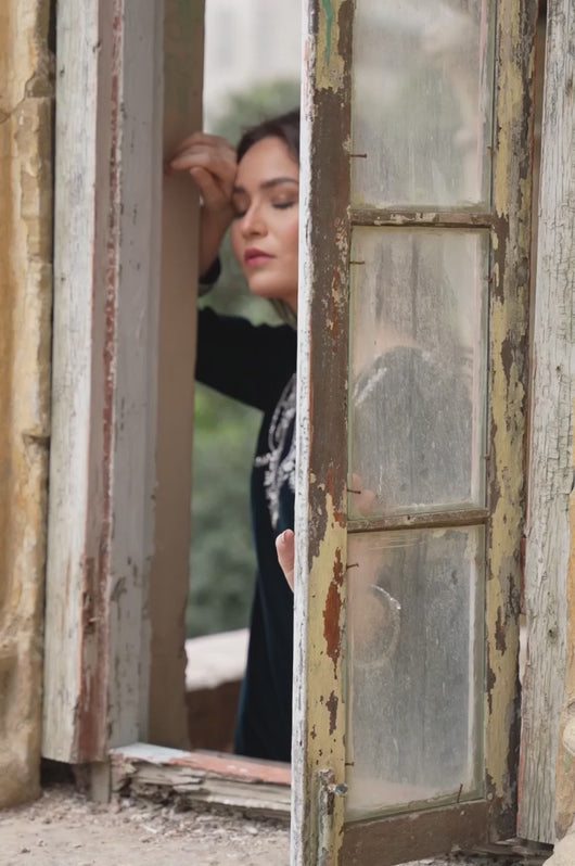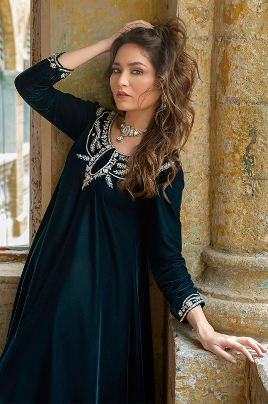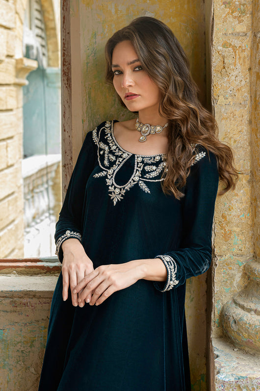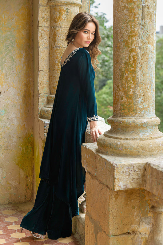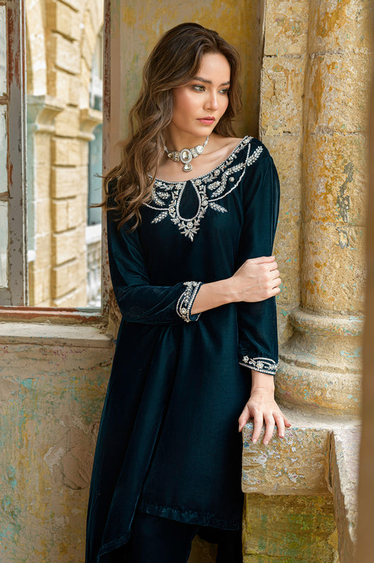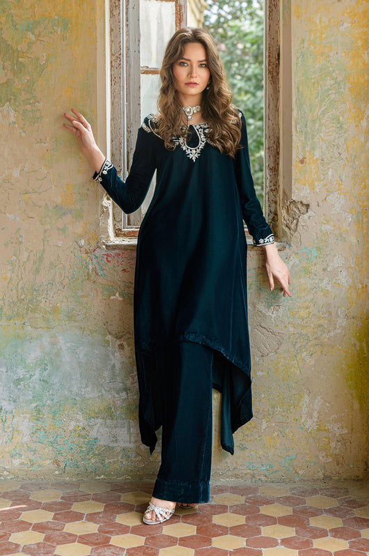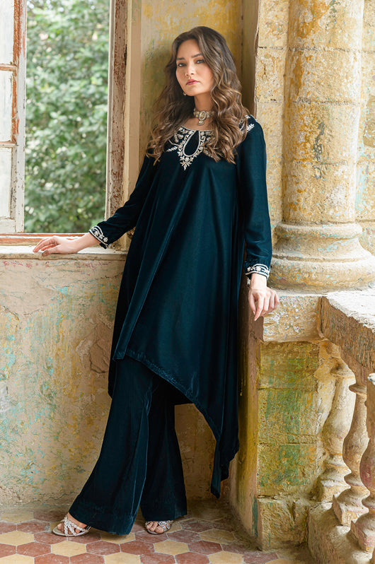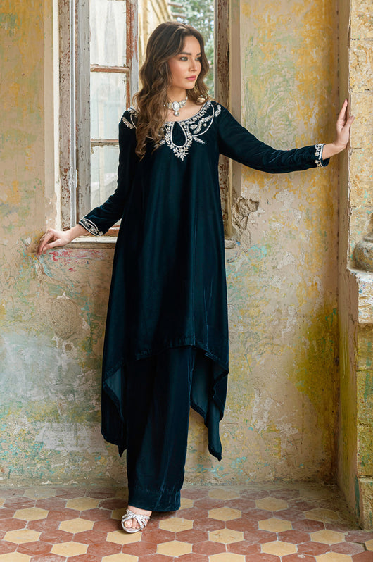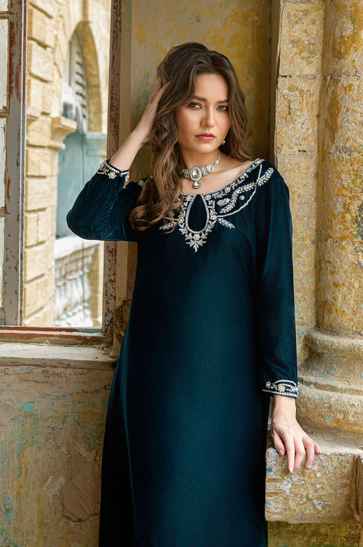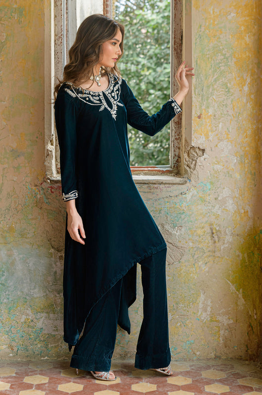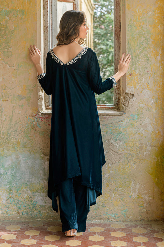 Tess is a draped style short shirt, length 36 cut in a way it hangs on the sides. The dress is made in teal blue velvet with embellished neckline and sleeves and a low back in all silver work. Perfect for dinner parties, birthdays, bridal showers, baby showers. Length can be customized.
