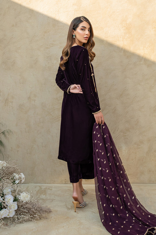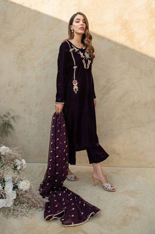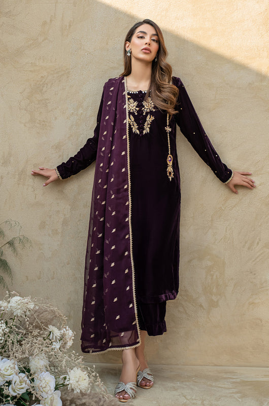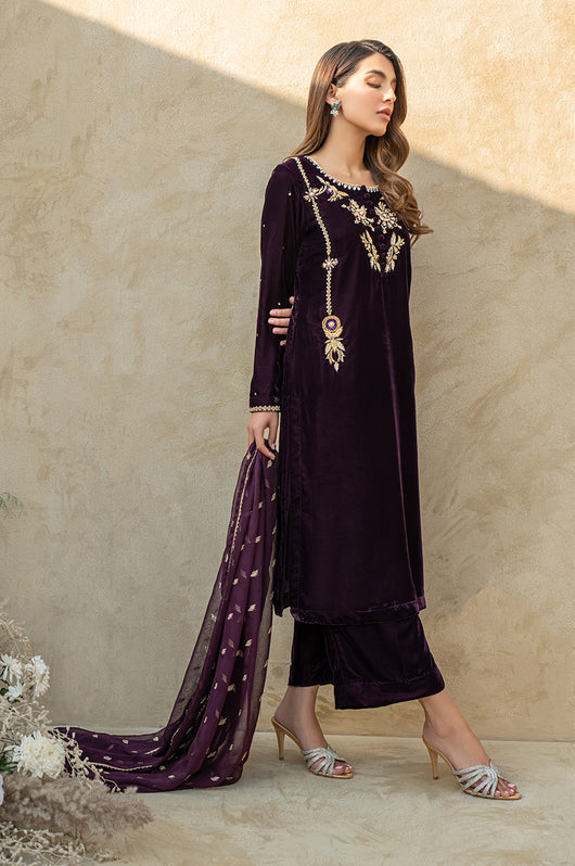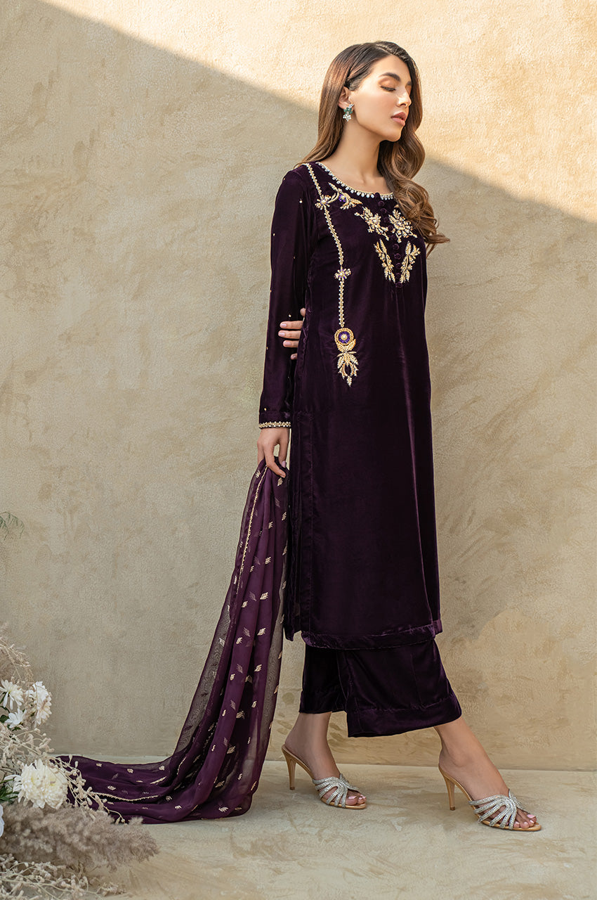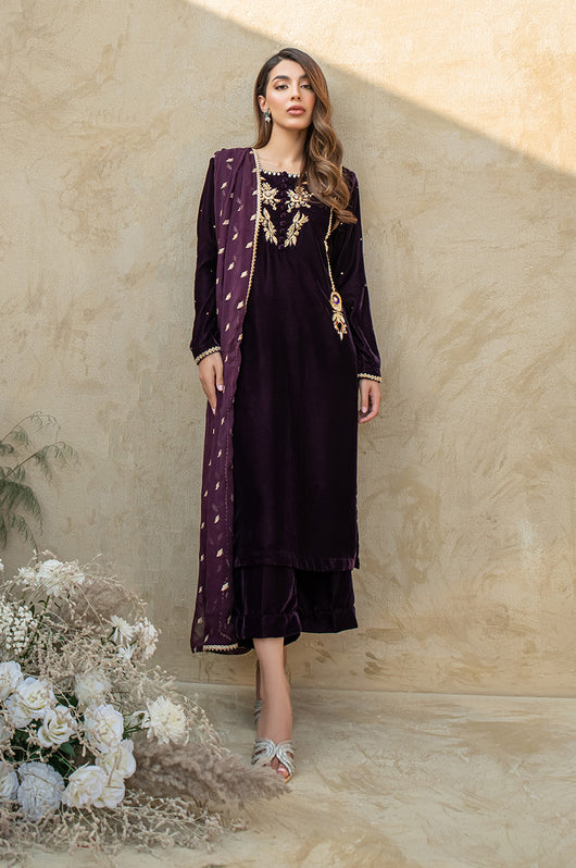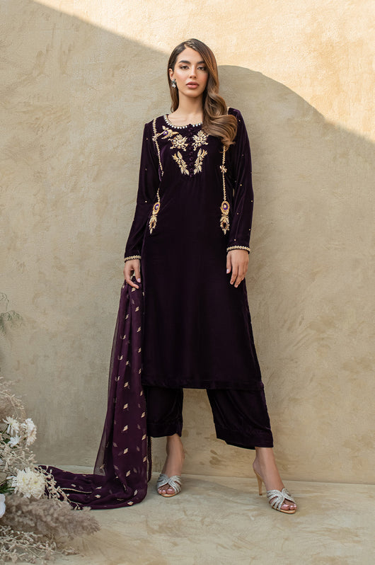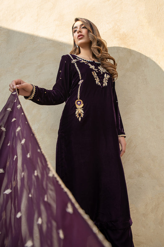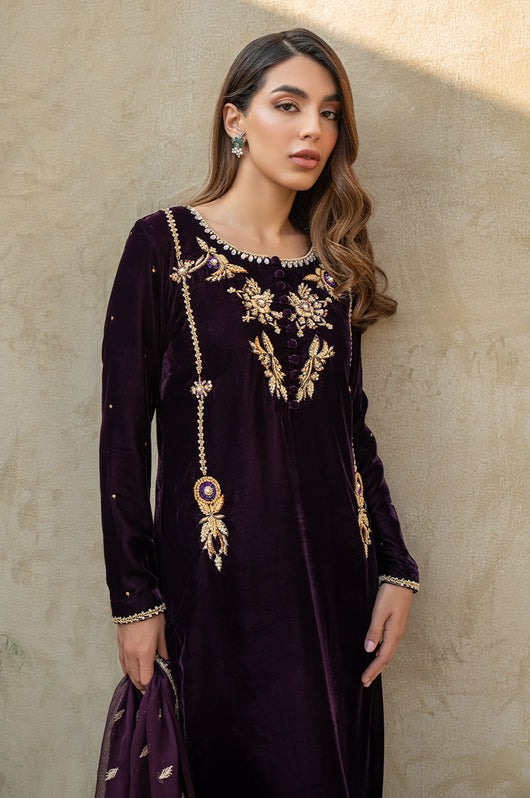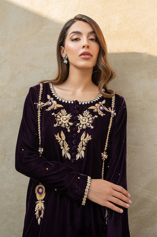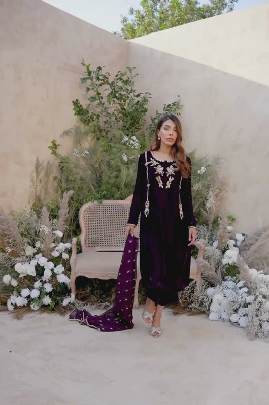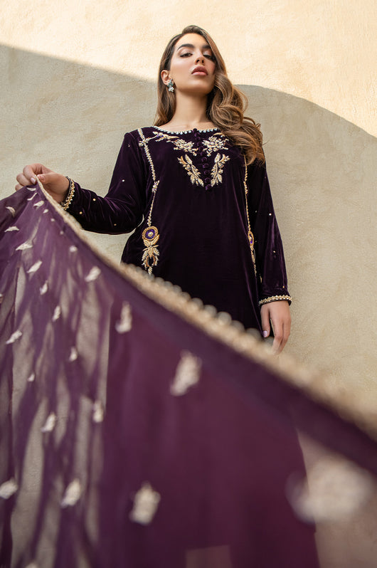 This long velvet shirt and culottes are the perfect blend of class and elegance. In a luxe purple-burgundy shade, the shirt features floral embroidery made in kora dabka and sitara, which further complement the ensemble. Comes with a chiffon dupatta in the same color with lace details to complete the look. The length of the shirt is 48 inches.