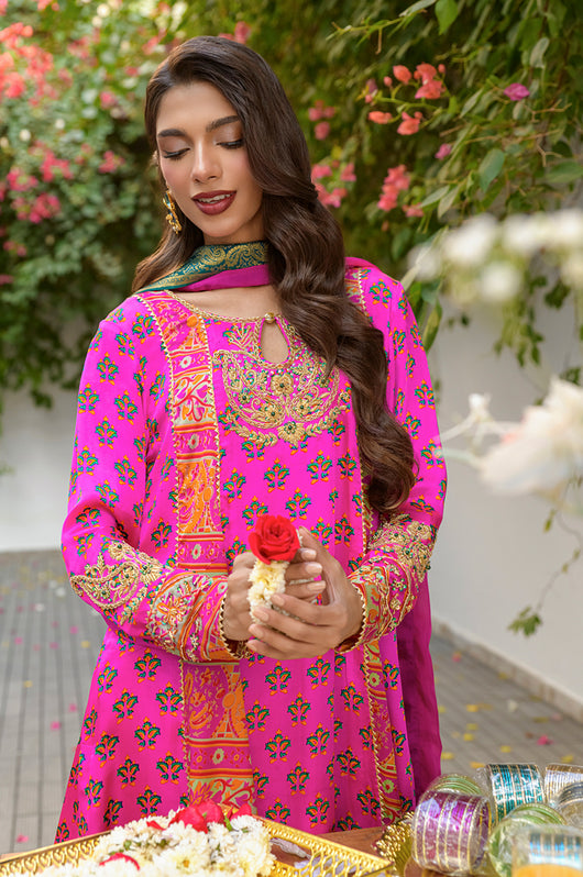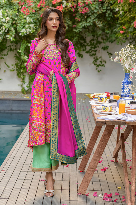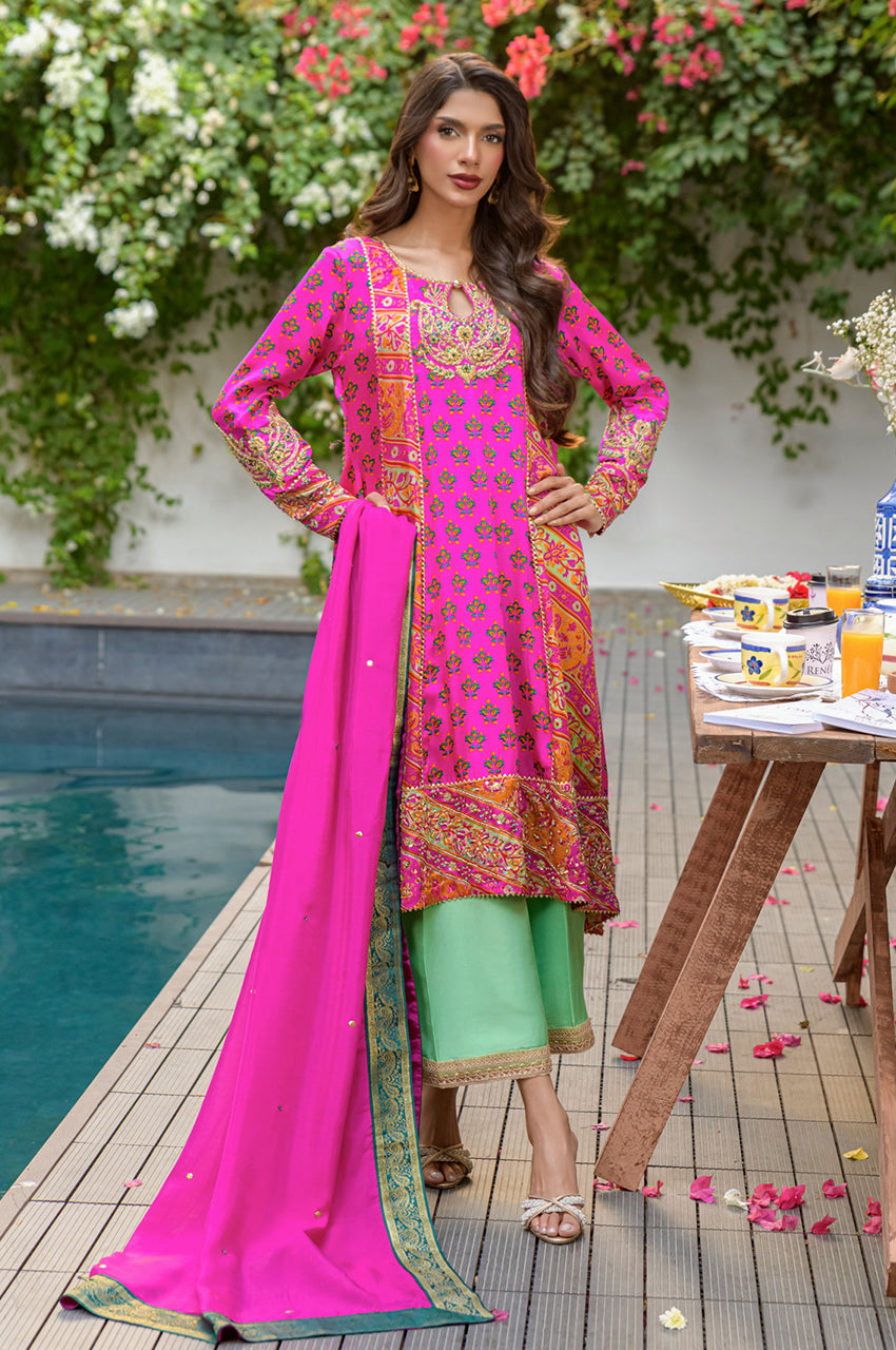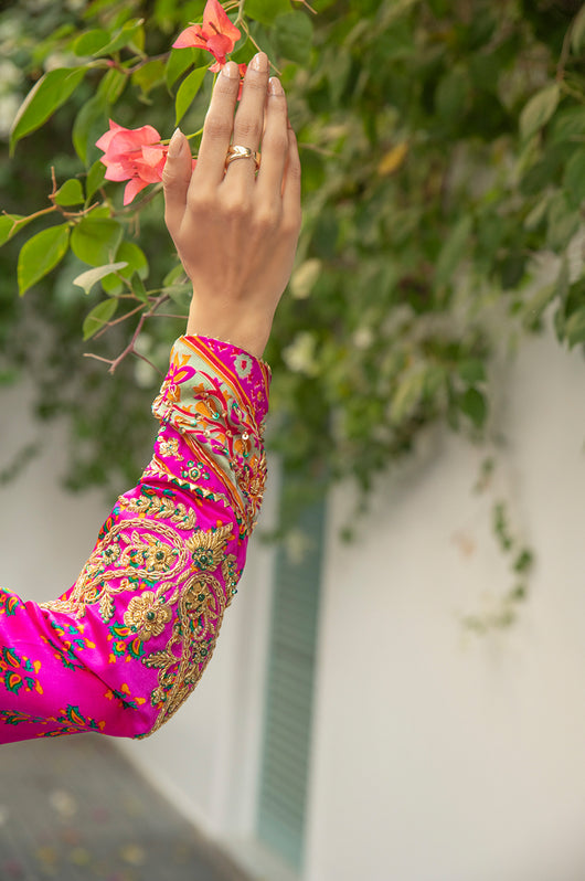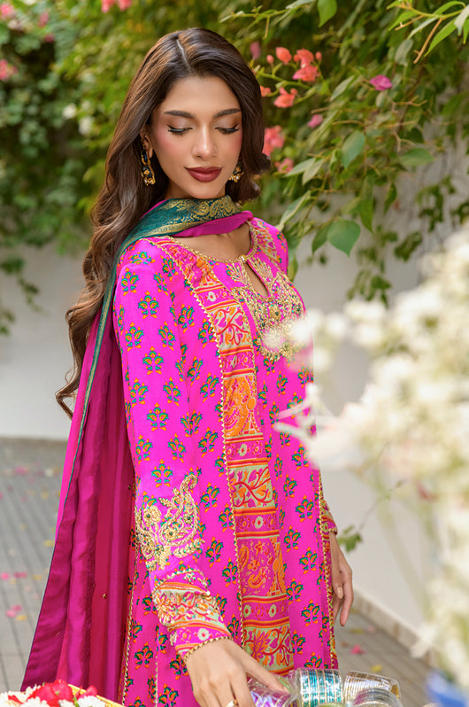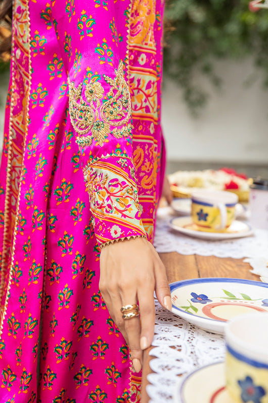 Veeda is a Fuschia colored kalidar in short length with a stripped pattern contrasting in between, made in 80 gms pure Charmeuse silk, with an 80 gms pure raw silk pants and a medium silk dupatta with chan details and a jamawar border all over the dupatta. The shirt is hand embellished with a delicate neckline and handwork all across the bottom daman with notes of emerald green and a heavily embellished motif on both sleeves and other handwork on the bottom of the sleeves as well. The back has tassel details and lace finishes on the pants to add to the outfit