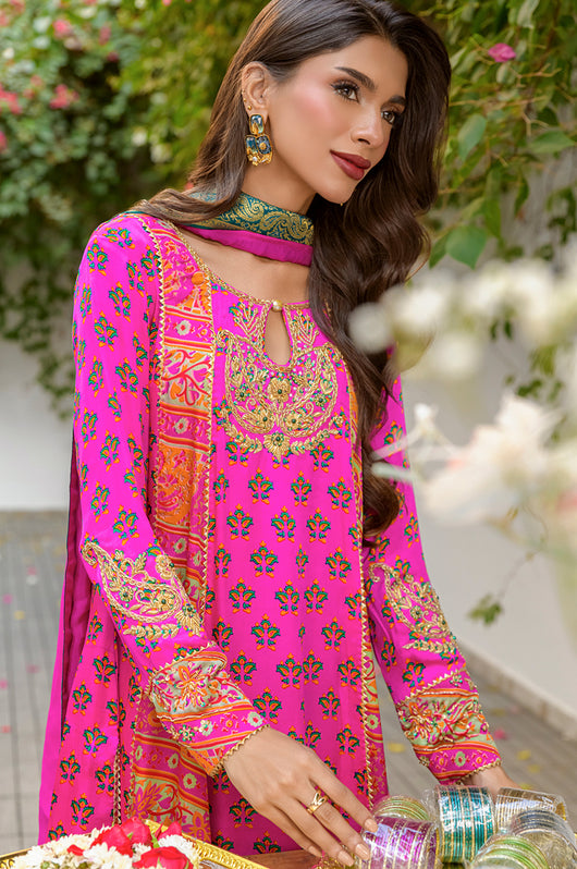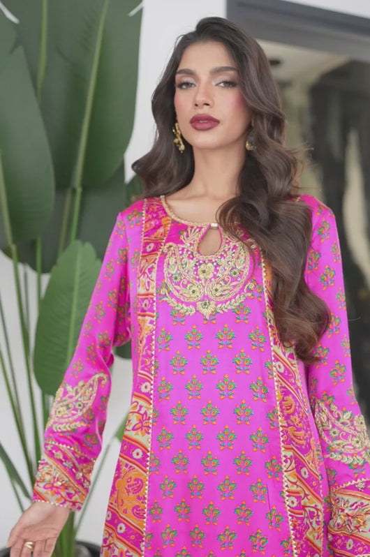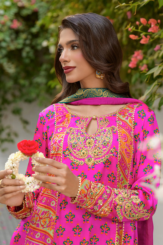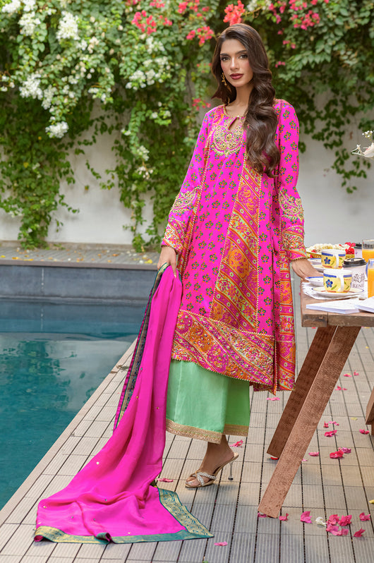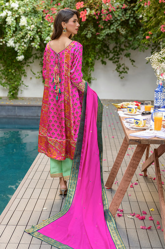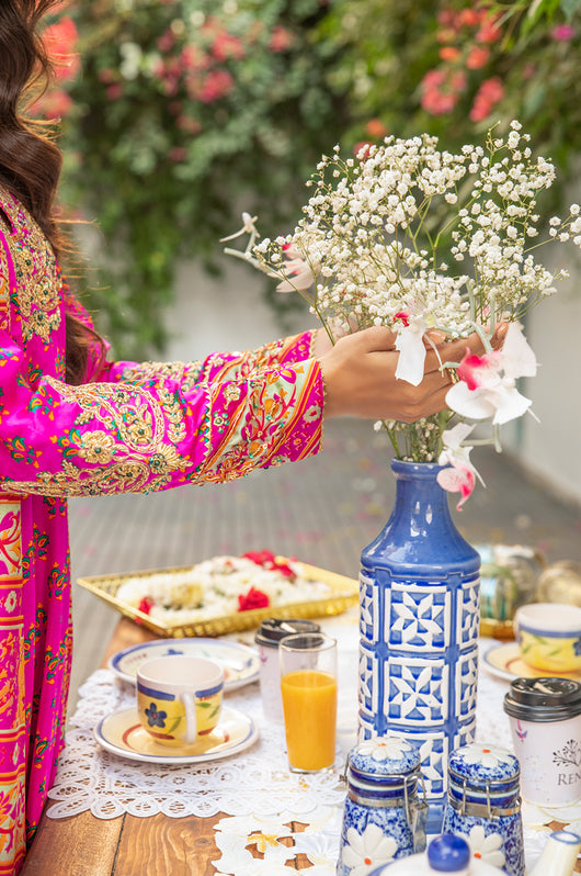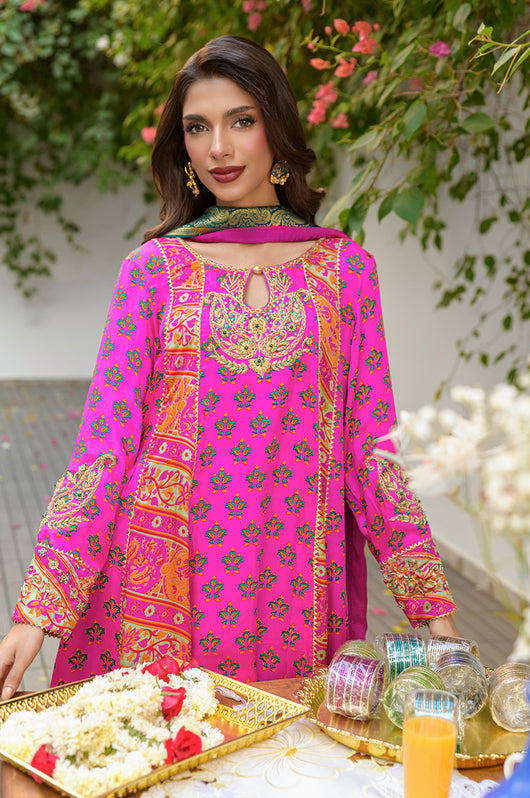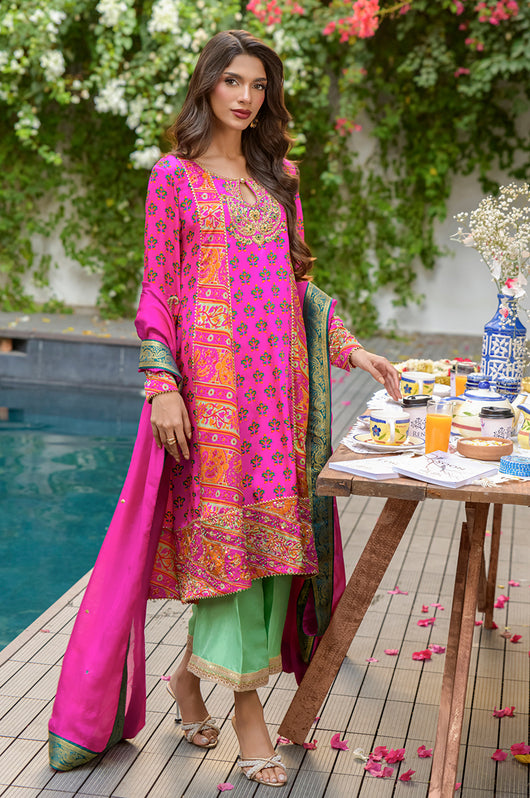 Veeda is a Fuschia colored kalidar in short length with a stripped pattern contrasting in between, made in 80 gms pure Charmeuse silk, with an 80 gms pure raw silk pants and a medium silk dupatta with chan details and a jamawar border all over the dupatta. The shirt is hand embellished with a delicate neckline and handwork all across the bottom daman with notes of emerald green and a heavily embellished motif on both sleeves and other handwork on the bottom of the sleeves as well. The back has tassel details and lace finishes on the pants to add to the outfit