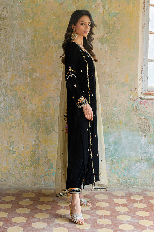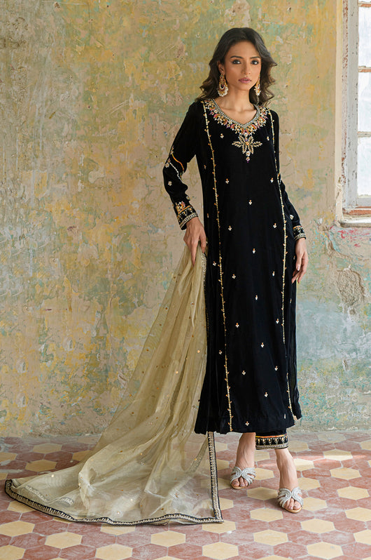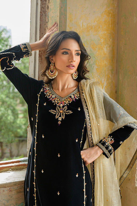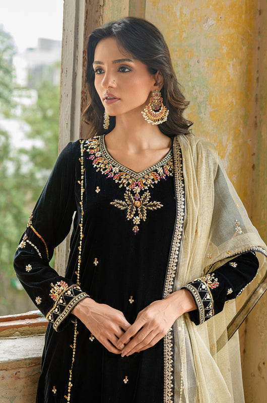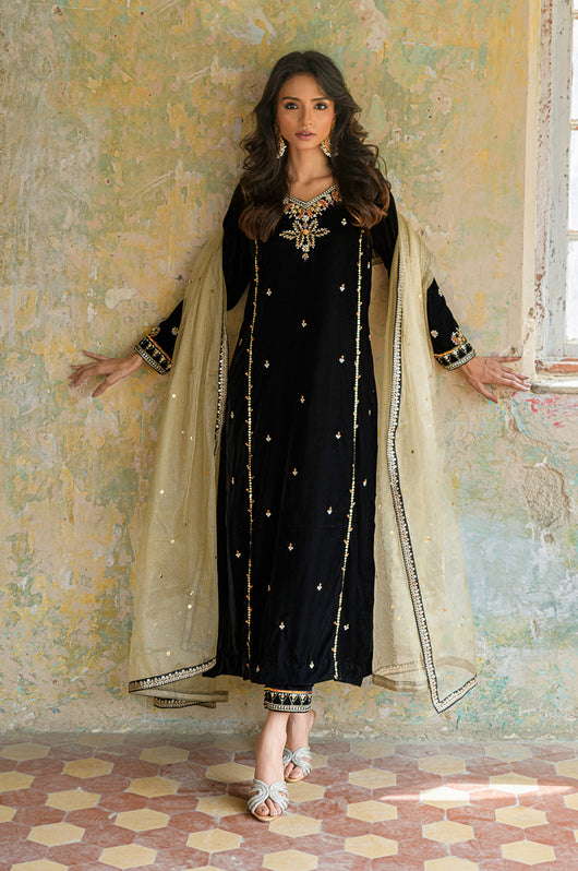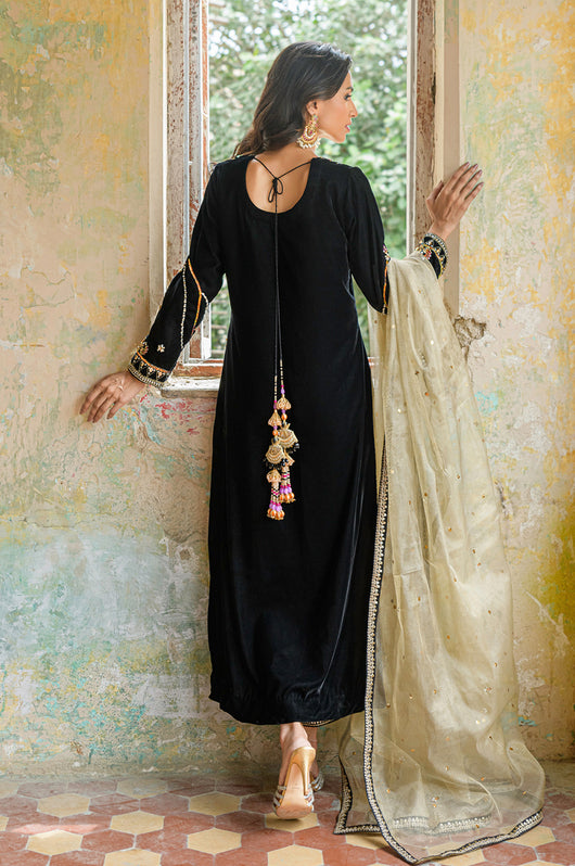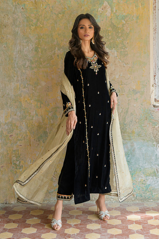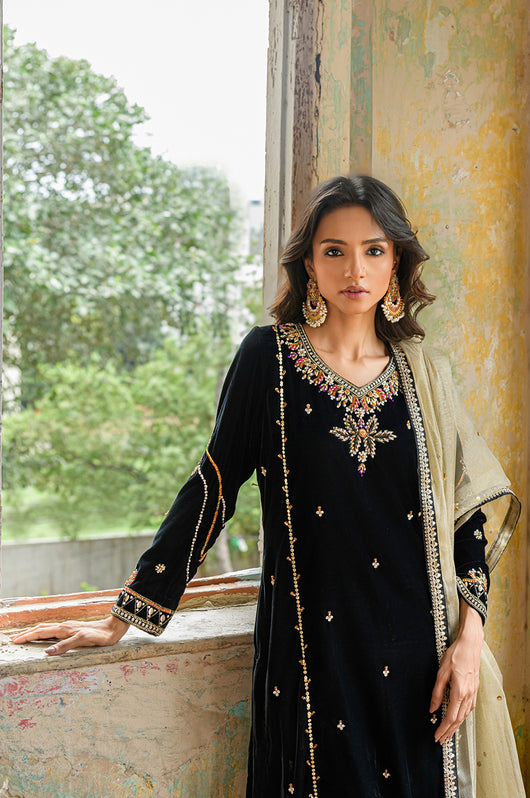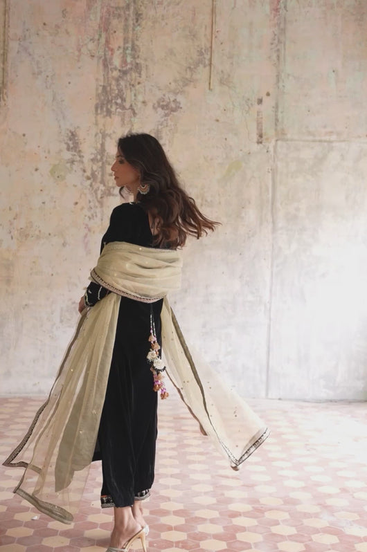 Velin is a black velvet base with embellished neckline, front and sleeves. The dress comes with black velvet straight pants with hand work details on the bottom. Signature tassel details in the back in the color of the resham added on the neckline. Accompanied by a mysori dupatta with bouti and chan details and lace finishes. For length customisation mention in the additional notes section. The model is wearing 48 inches length and size XS.