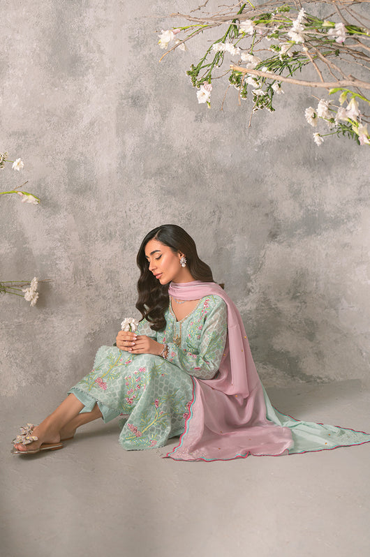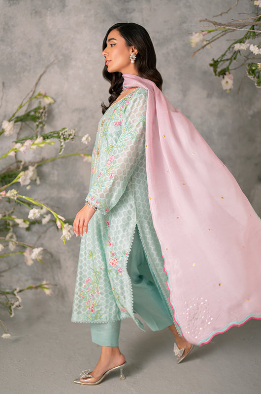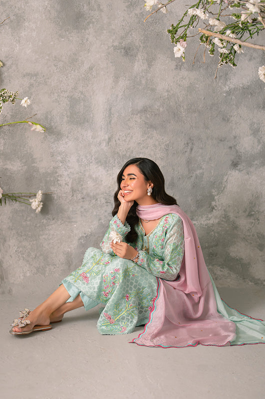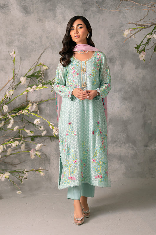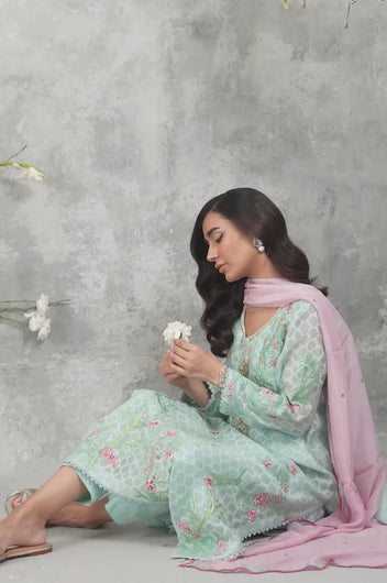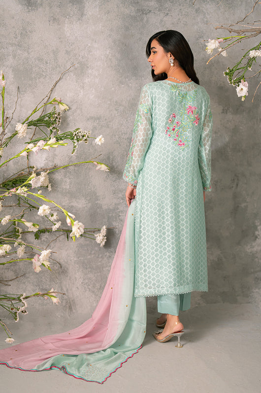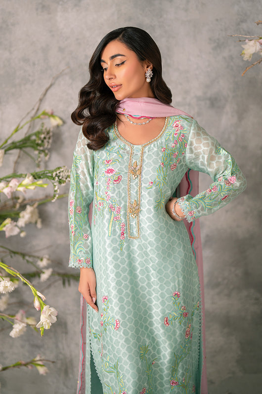 Yara is a premium silk khadi Tiffany blue/green colored dress that comes with a heavily embroidered shirt in front and back, and a contrast Rose Tan colored dupatta. There’s hand work on the shirt with beads, stones and other light material and a hand embellished neckline with leaf shaped buttons to enhance the look. Dupatta is embroidered and heavily hand embellished all over. Comes with straight pants made in silk.