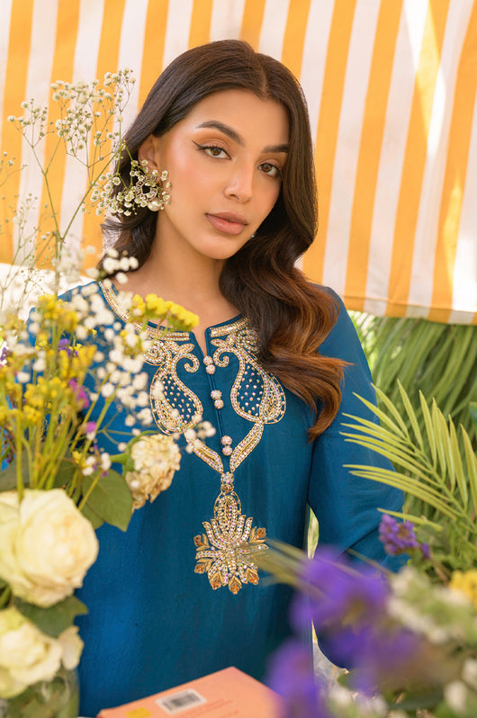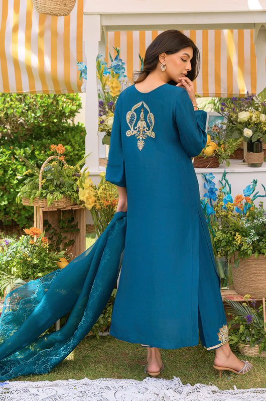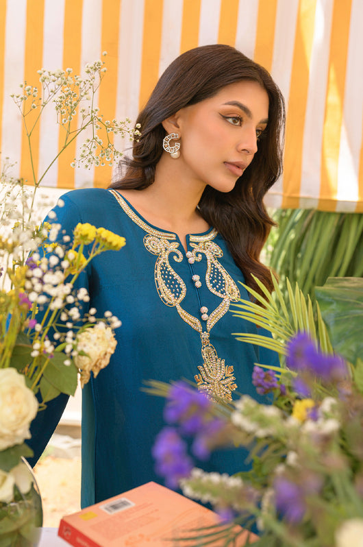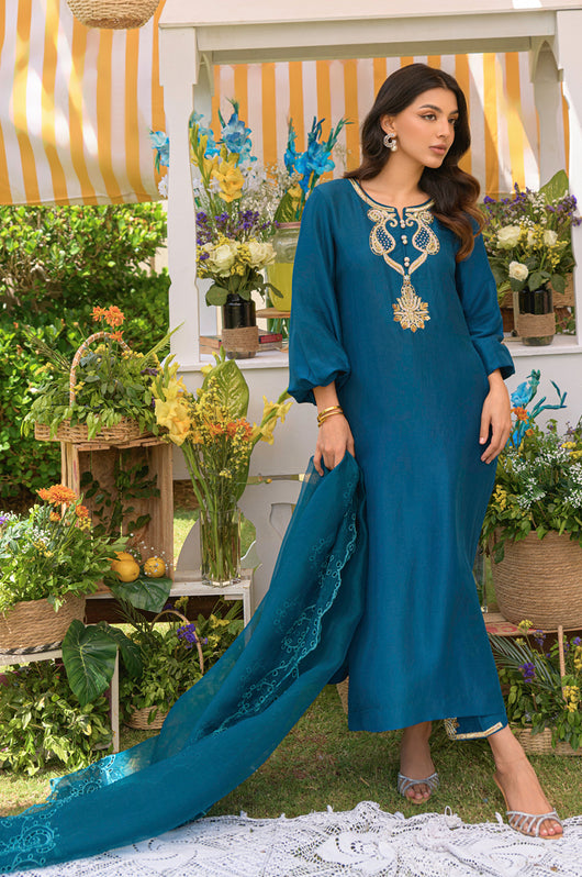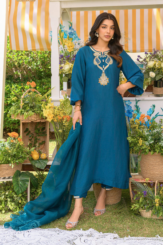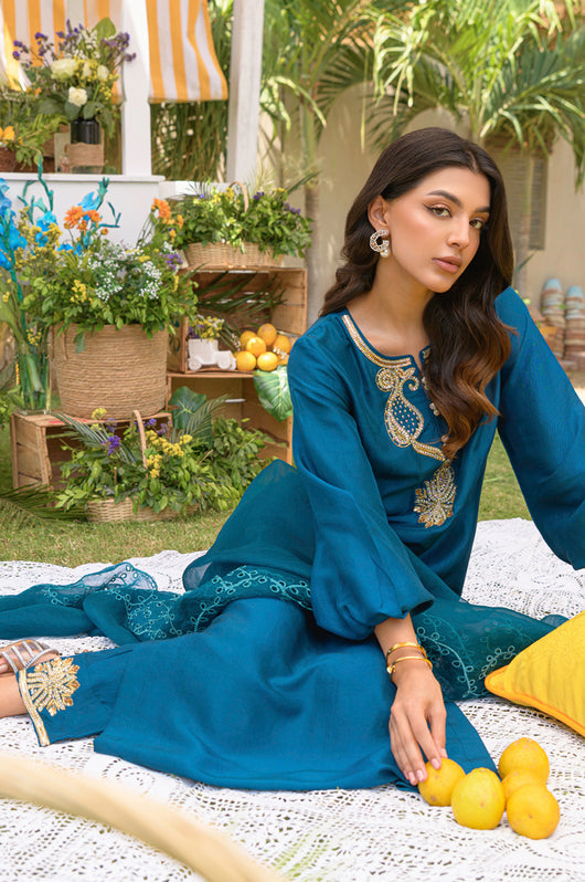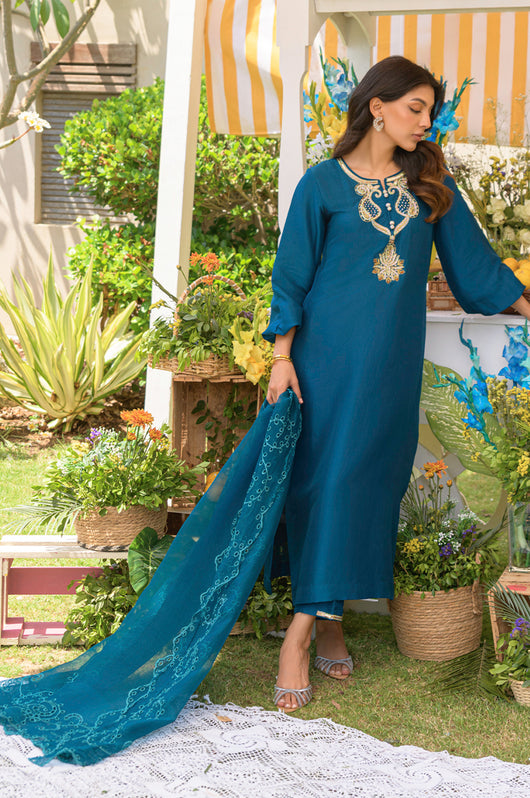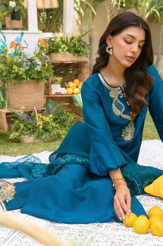 Yisra is a teal blue pure 80 gms raw silk suit, with a heavily embellished neckline in the front and back. The pants of the outfit also have handwork on them. Comes with a pure organza dupatta with embroidered borders on all four sides.