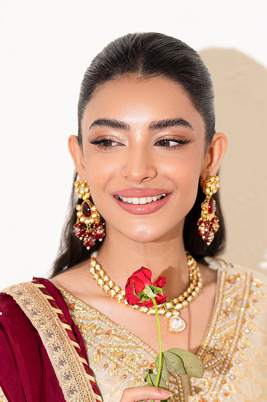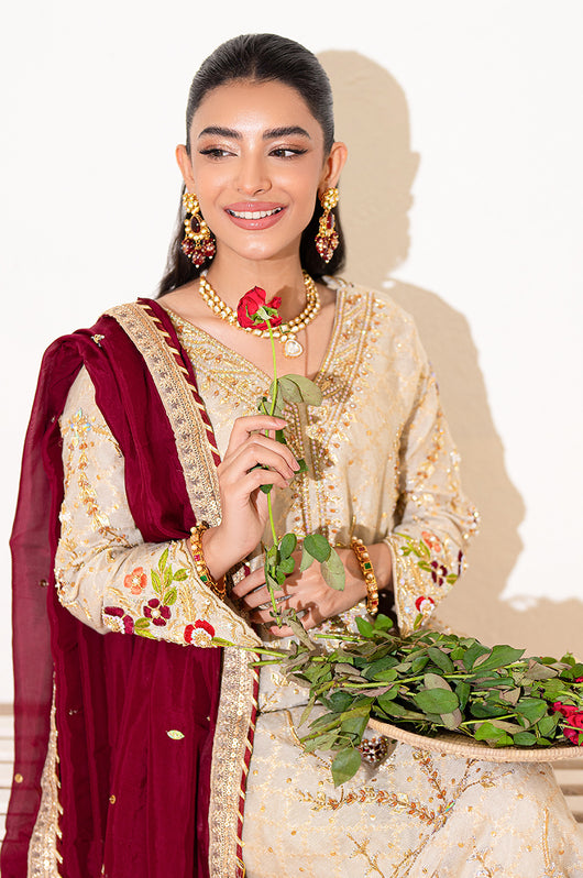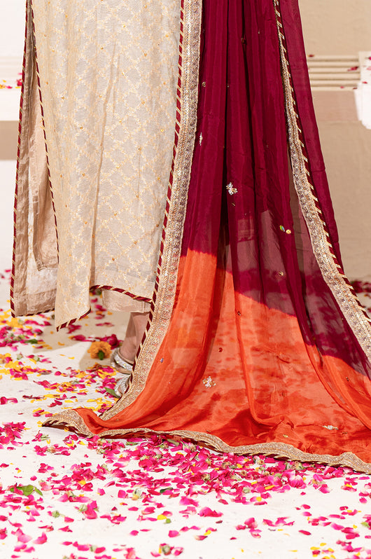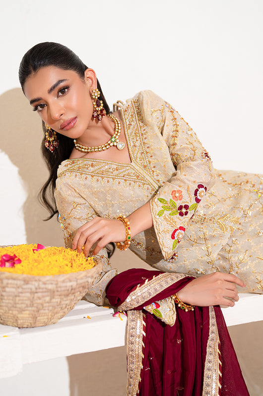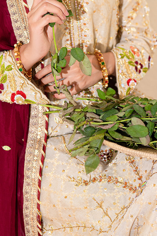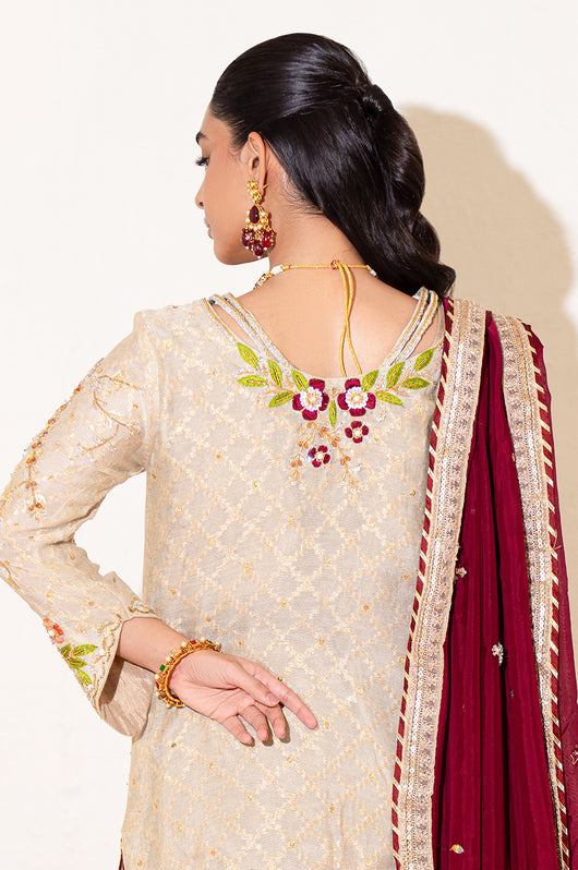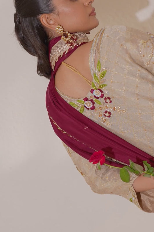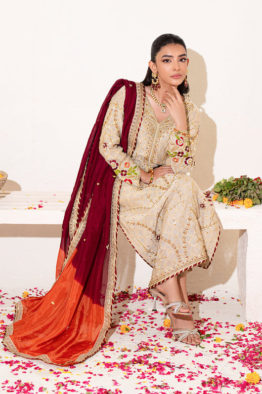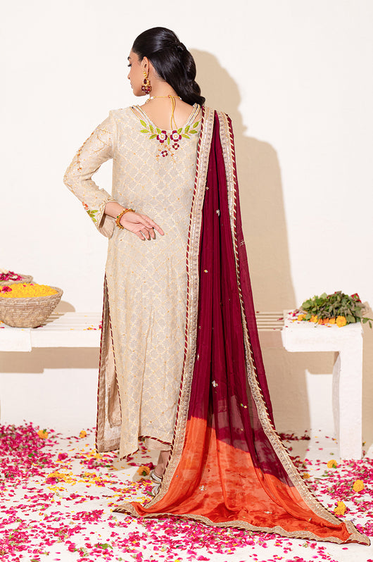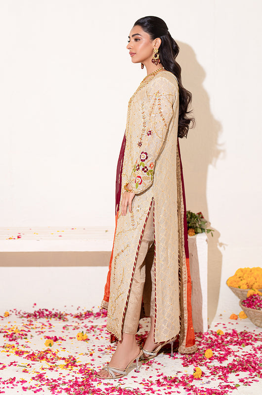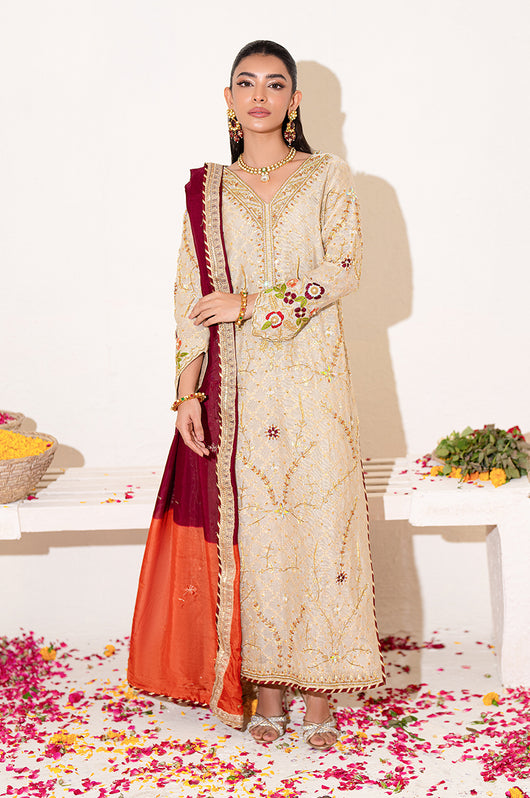 A beige long shirt made in pure zari khadi net is heavily embellished in all handwork with a jaal on the front and sleeves with contrast colored resham flowers made on the sleeves and the back of the shirt. There are embellished strap details in the back and chan all over. Comes with a heavily embellished dupatta in two shades with 2.5 inches wide border and straight raw silk pants.
