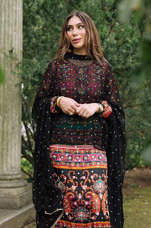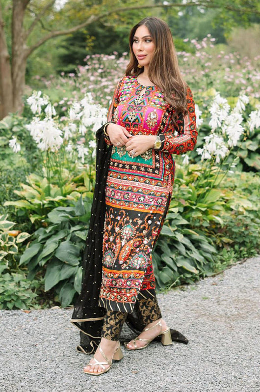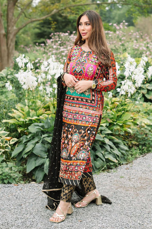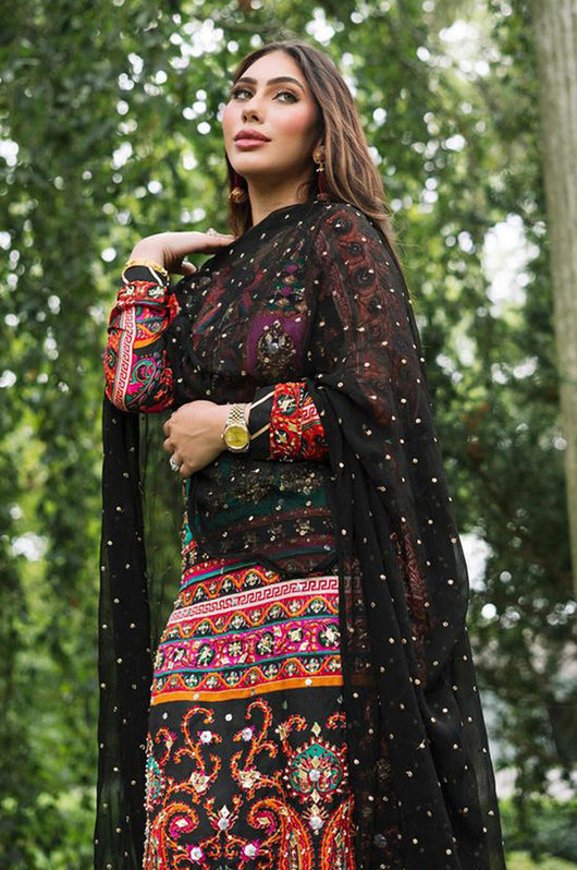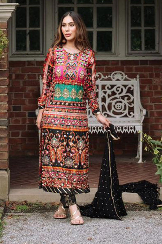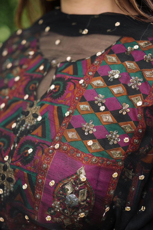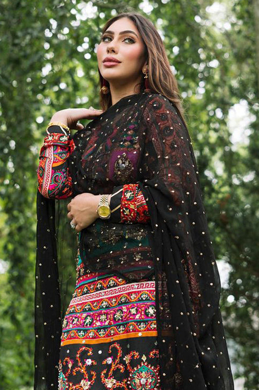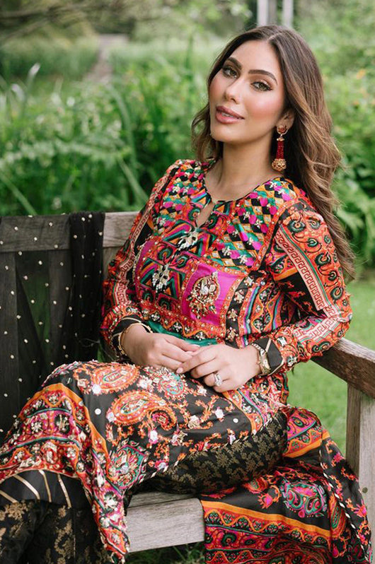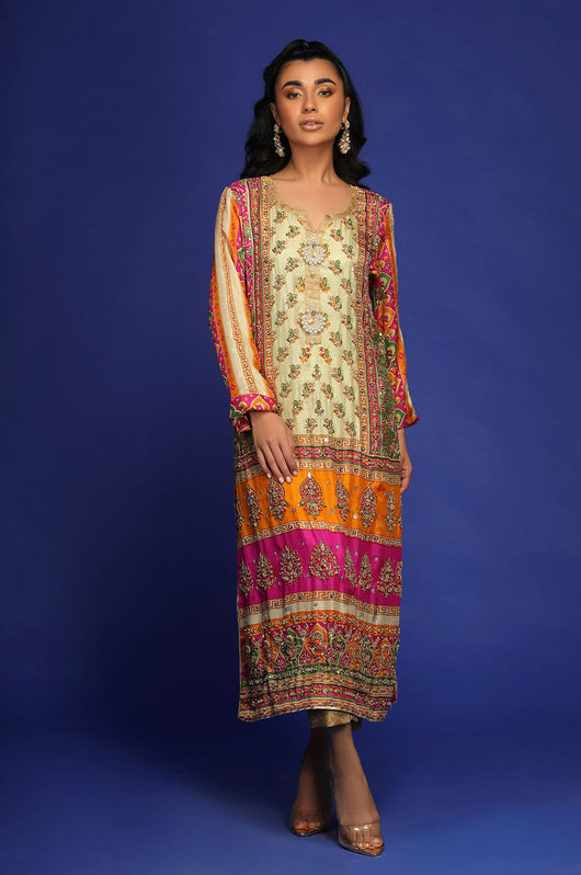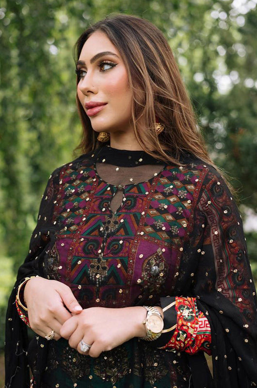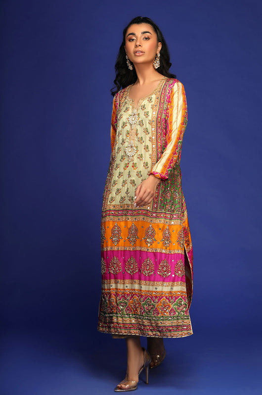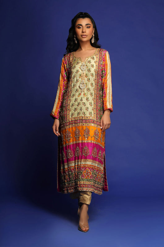 Zarih is a heavily embellished digital printed shirt comes as a three piece dress with jamawar pants and a base green Mysori silk dupatta. The neckline has embellished details to complete the look.