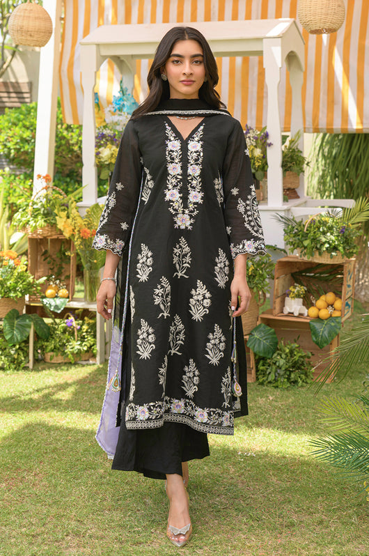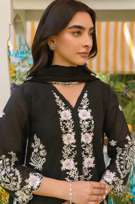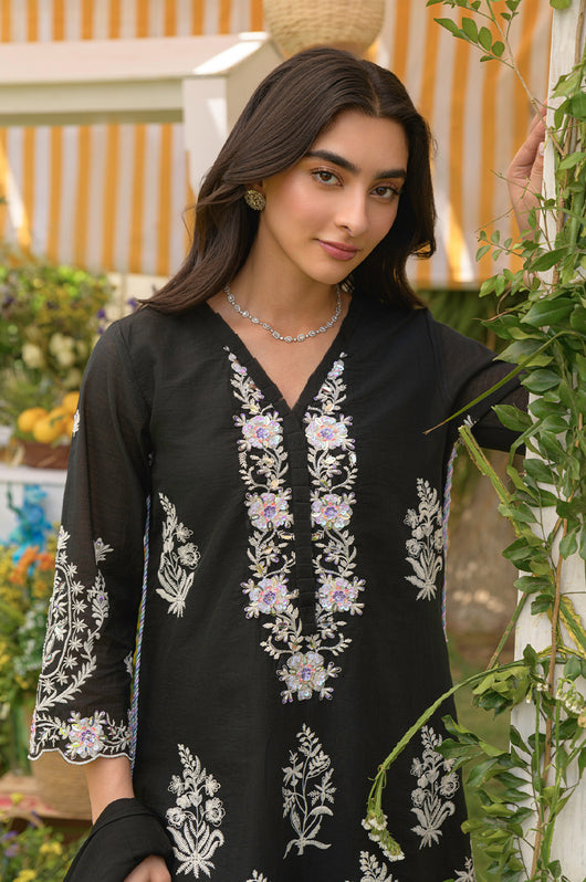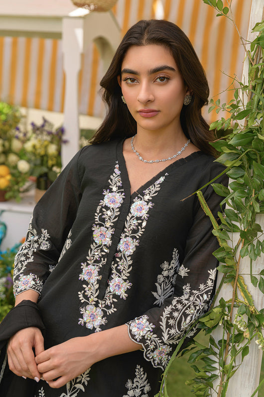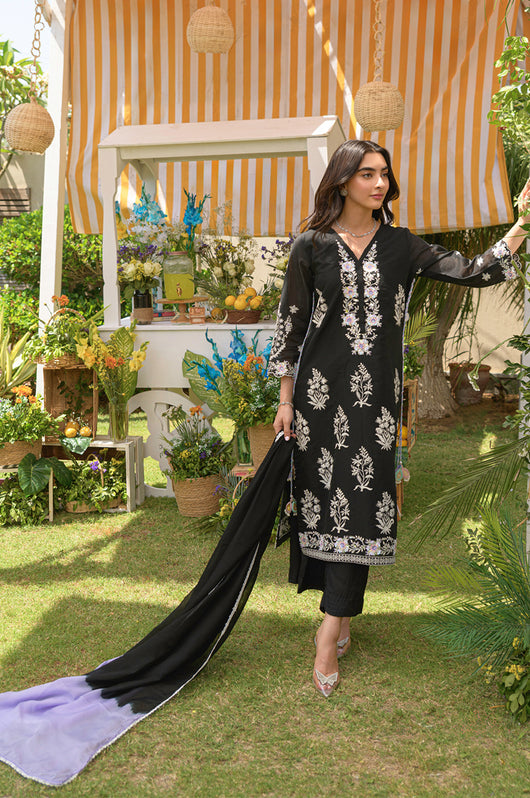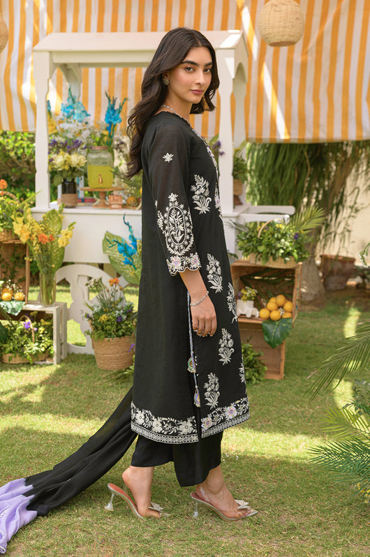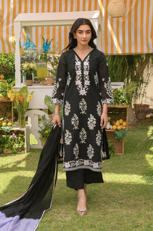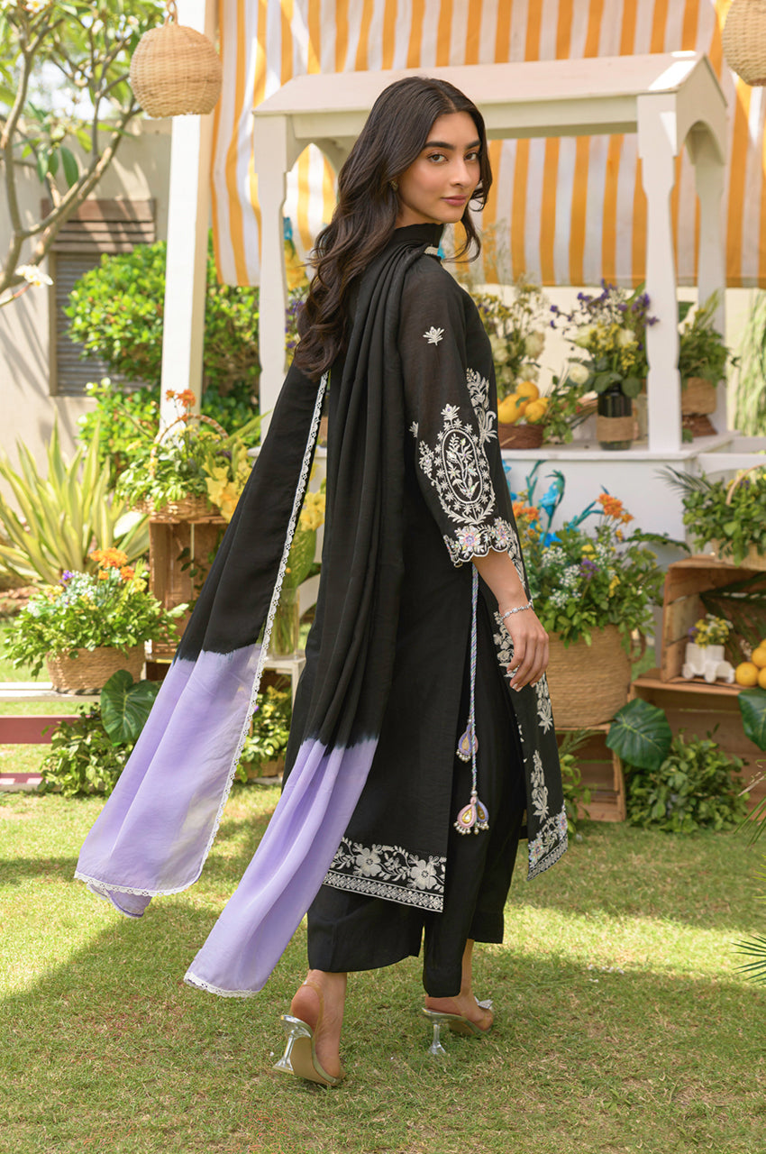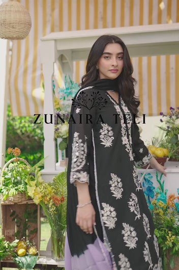 Zayen is a mid-length shirt with embroidered details all over, the shirt can be made in swiss voile or butter silk for a more flattering look. There is a heavily embellished neckline with multi-pink and purple-colored shaded embellishments stitched all over on the daman, sleeves, and neckline. The outfit comes with relaxed-style pants and a black and lilac dupatta to complete the look.