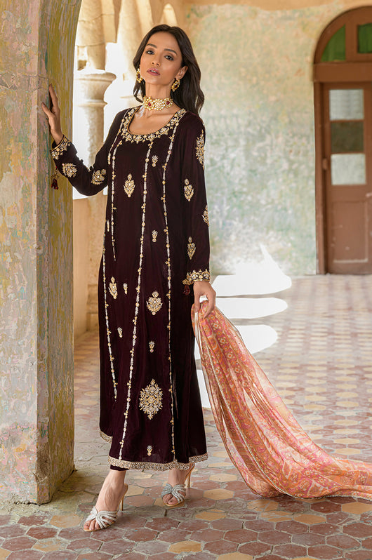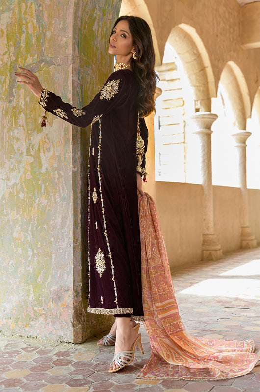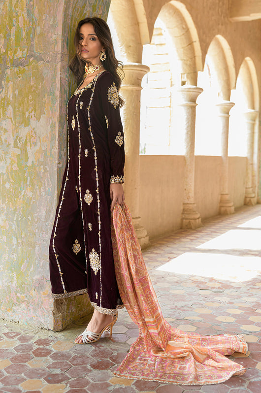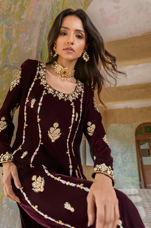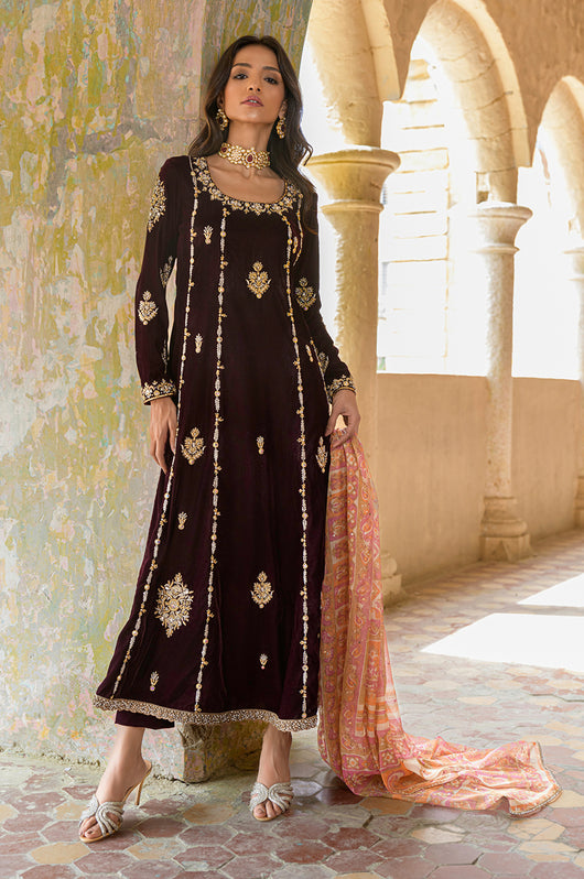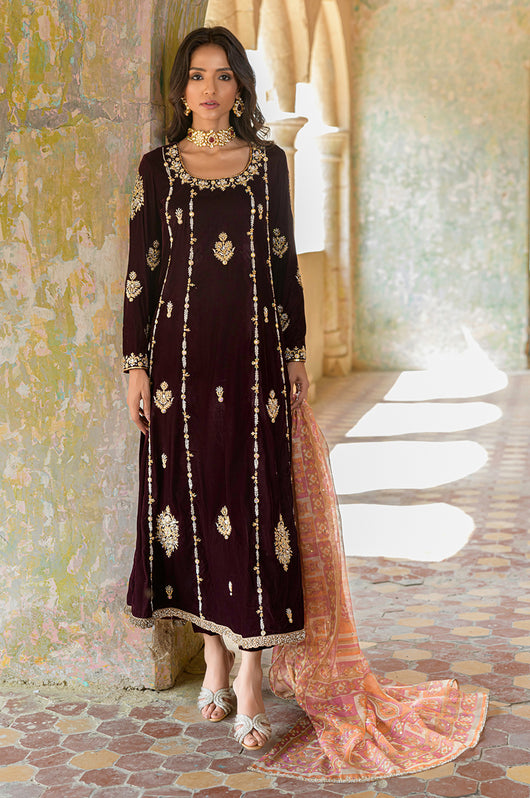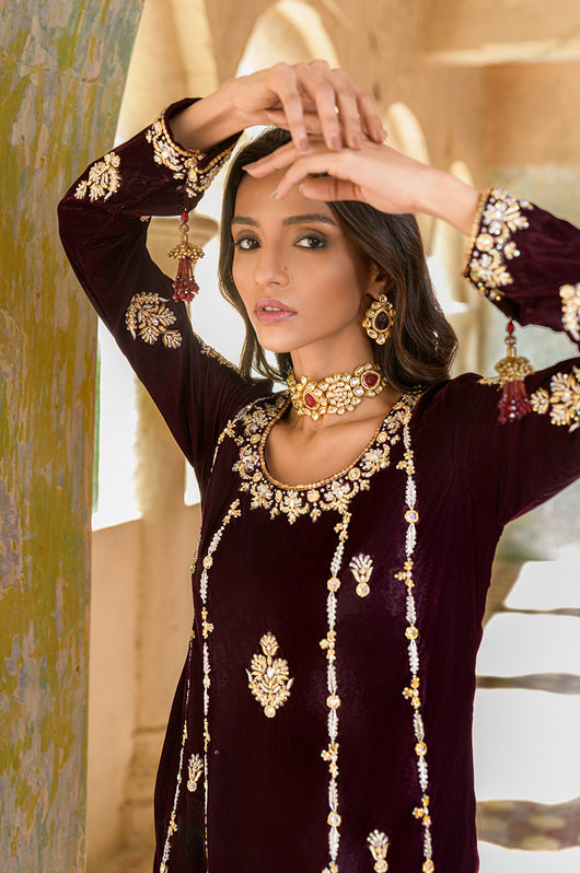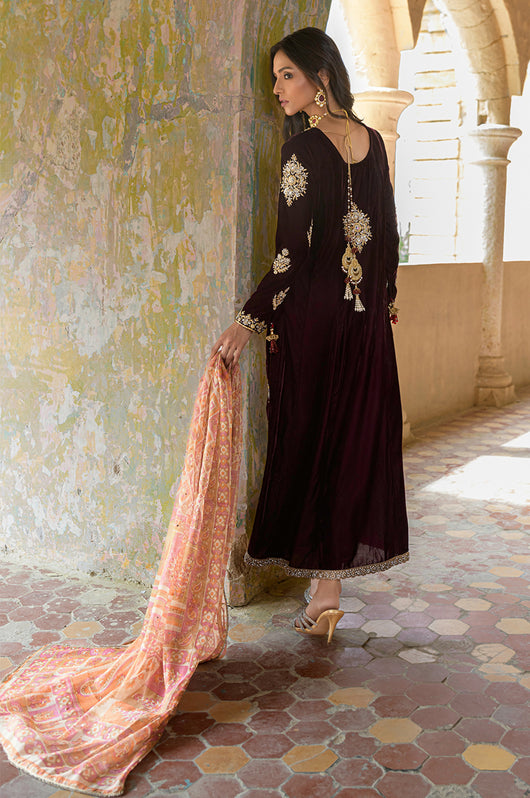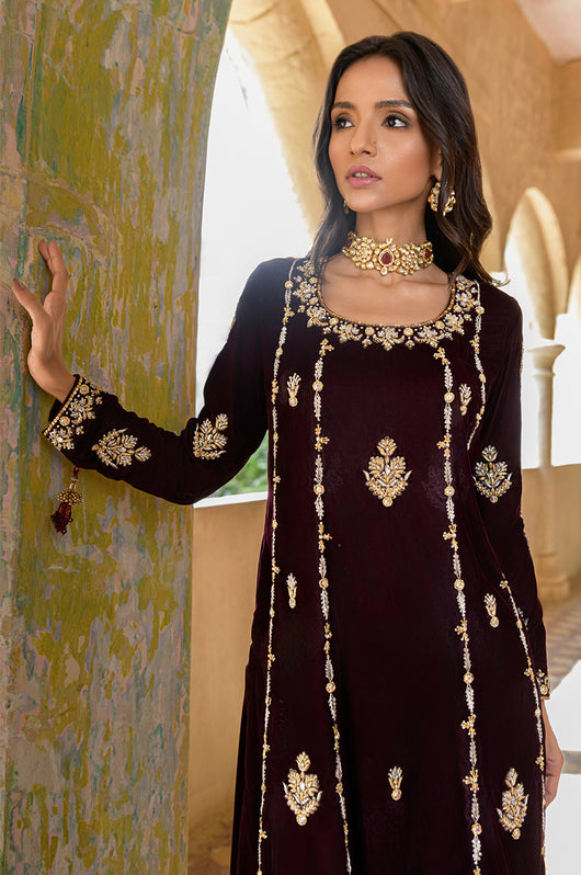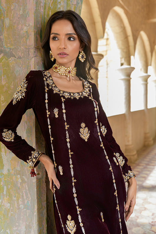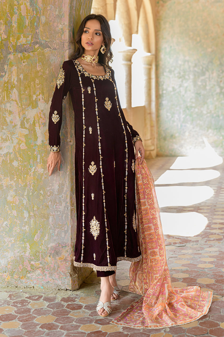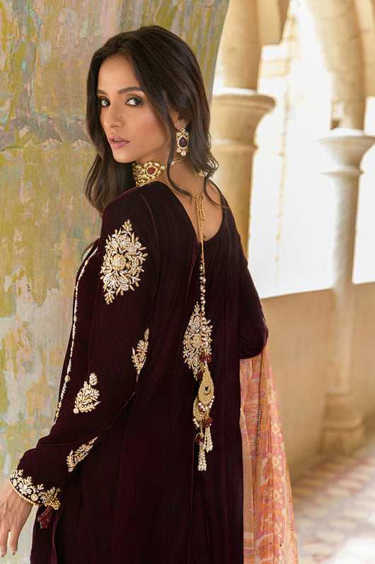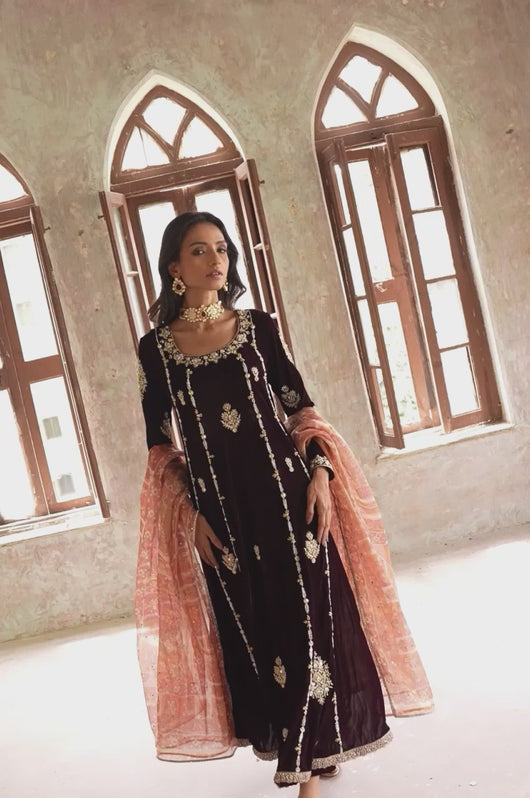 Zerin is a beautifully embellished velvet on the notes of dark deep maroon/brown. It’s an A line kalidar with work on the kalis of the shirt, with motifs on the daman and at the back. The sleeves are heavily embellished as well. Daman is embellished with handwork details appliquéd on the shirt. Tassel details in the signature RZT style on the sleeves and in the back. Comes with straight velvet pants and a mysori chiffon digitally printed dupatta with heavy embellishments all over. Length of this shirt is 50 inches. Please mention in the notes your customized length in additional notes section when placing the order.