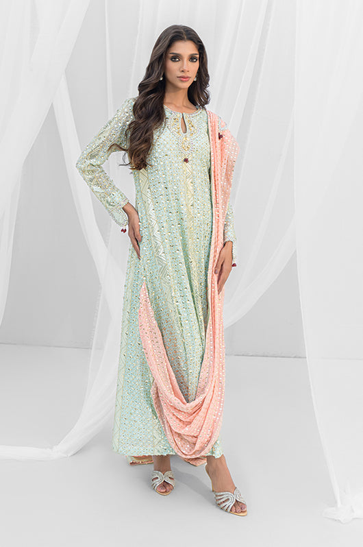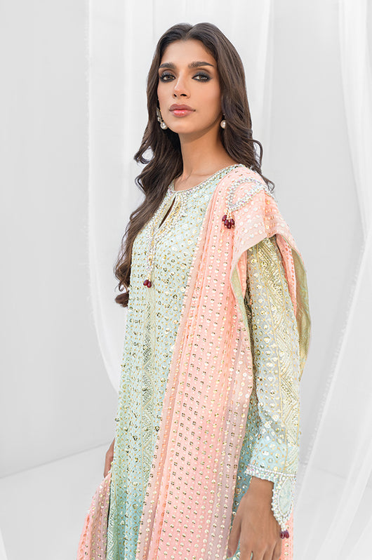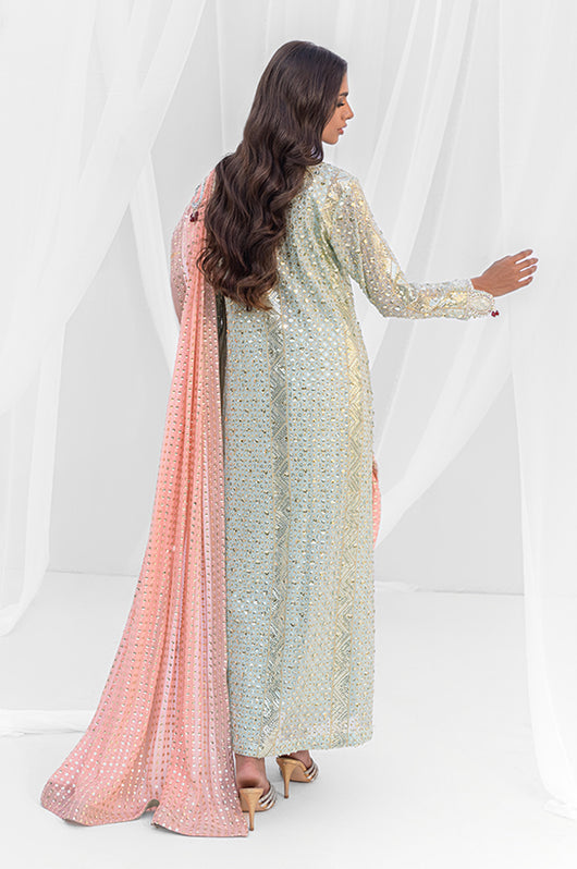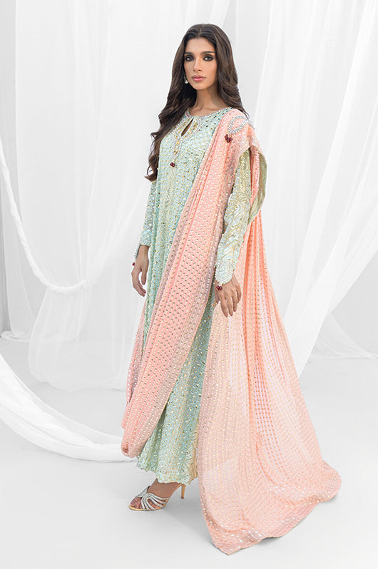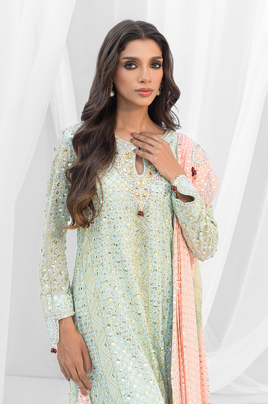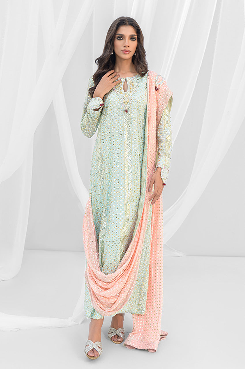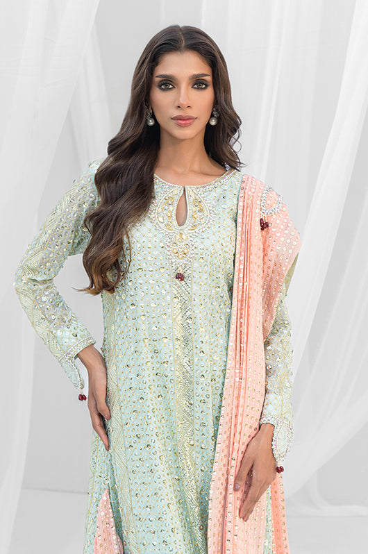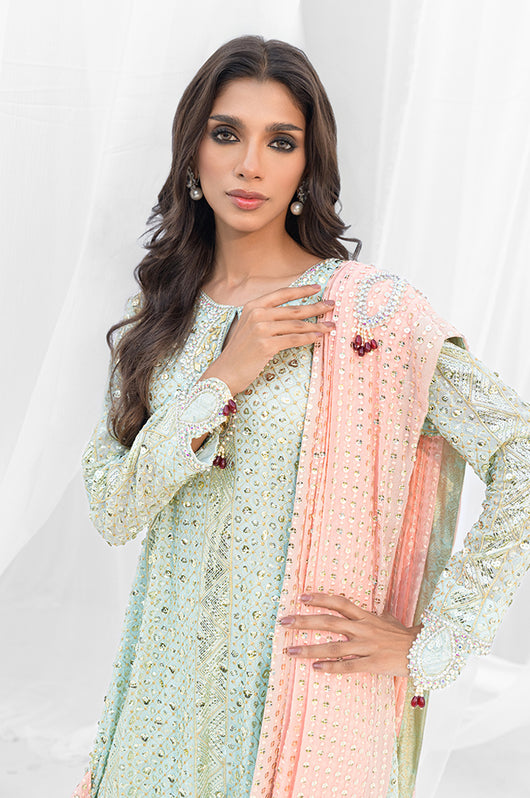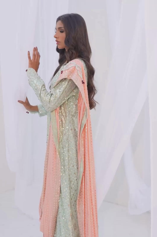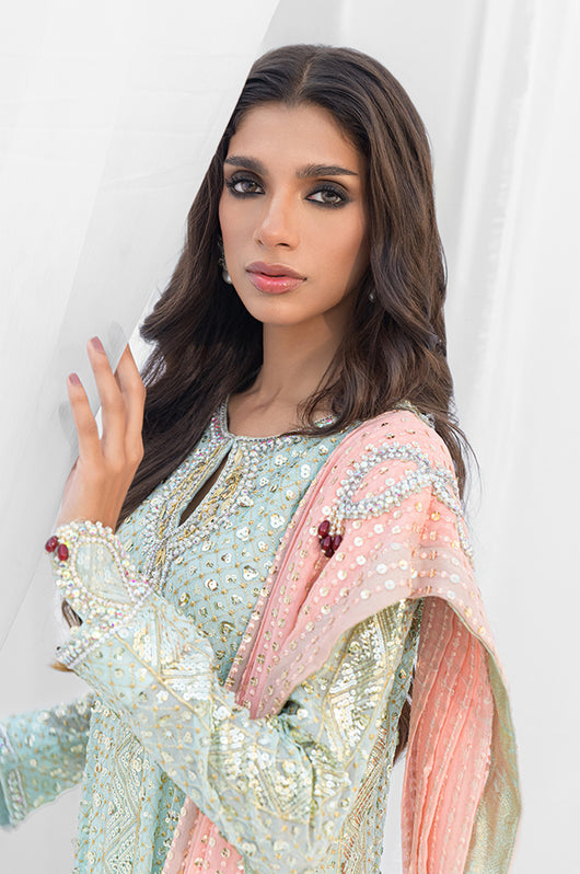 Zimal is a tiffany blue dull gold embellished fabric made in pure georgette chiffon. The dress has a detailed neckline and sleeves made in crystals and in mahroon ruby contrasted stones. The dress is draped in our signature style dupatta cut with hand embellished details on the shoulder and jamawar finishes on the dupatta all over. Comes with a bosci silk pants in same color as the shirt. Length of the shirt is 49 inches and the dupatta is 3.25 meters long.