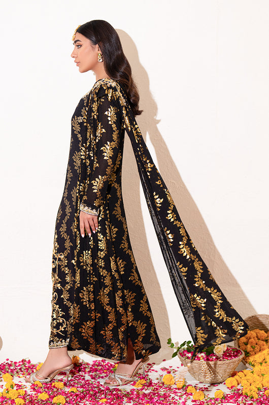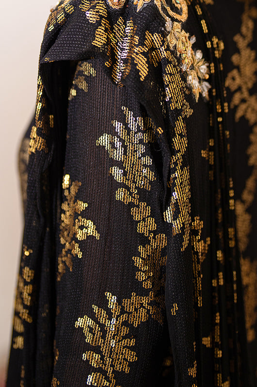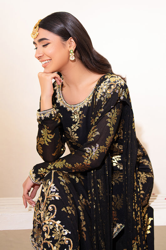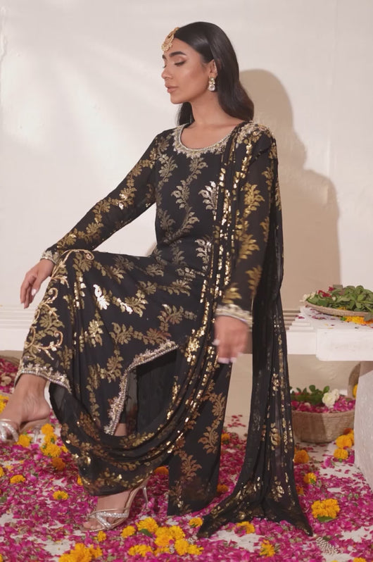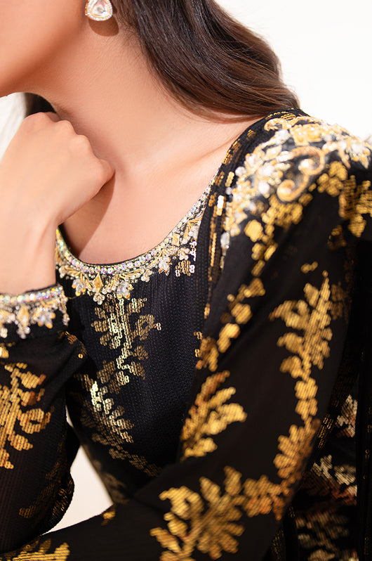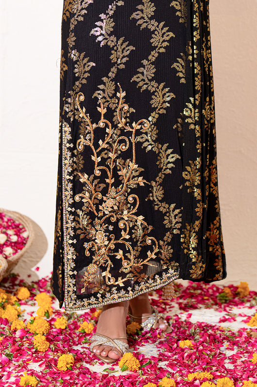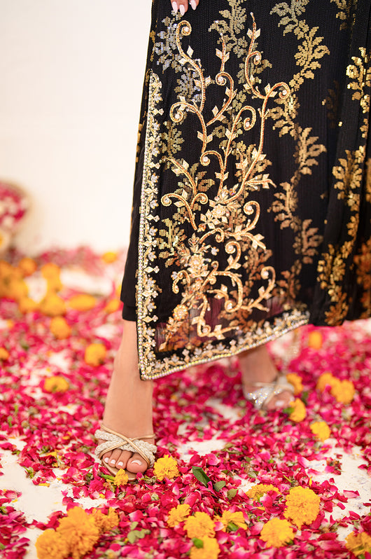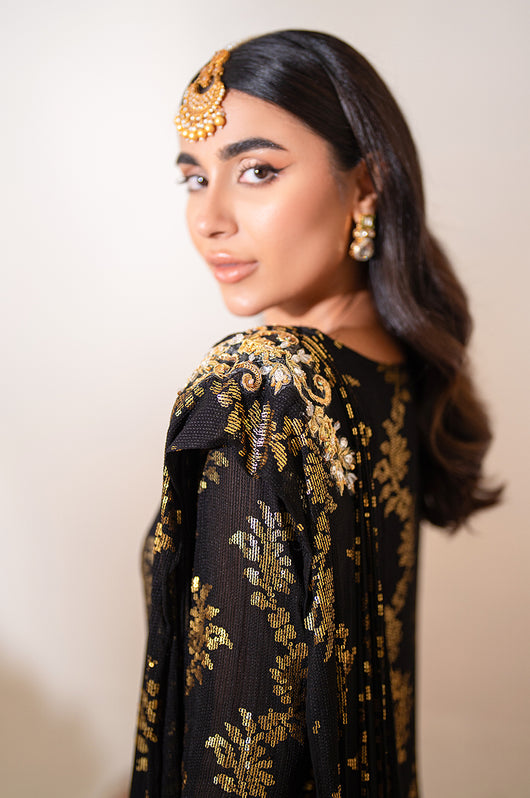 Zola is a gold sequined black base fabric made in pure chiffon cut in a drape style dress with a heavily embellished shirt on the left and work all over the chaks and neckline and sleeves of the dress. There is a motif on the shoulders of the dress as well that matches the work on the shirt. The look is completed by adding tassels on the ends of the dupatta. Comes with a black bosci silk pants.