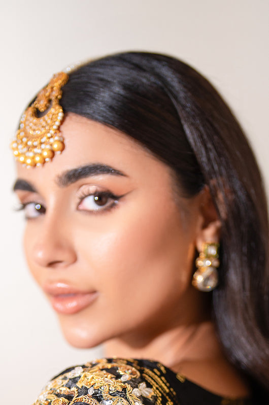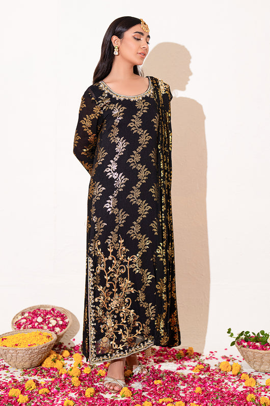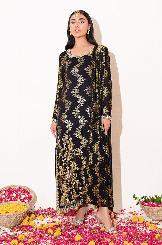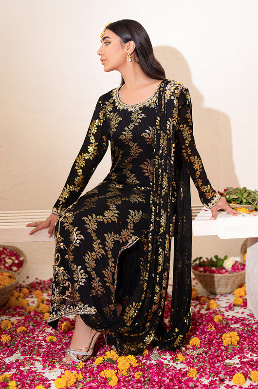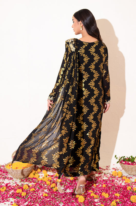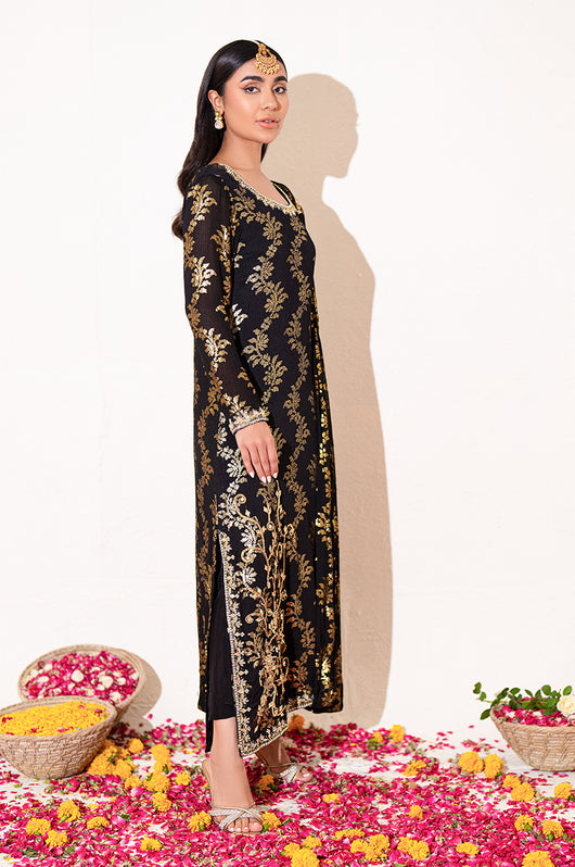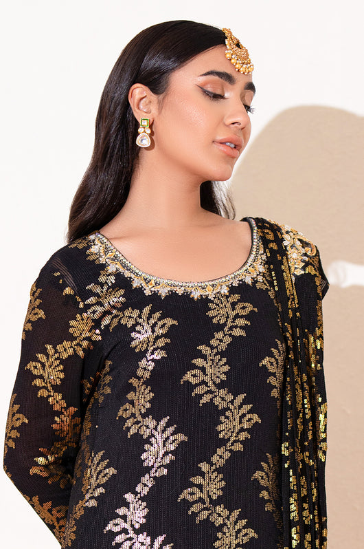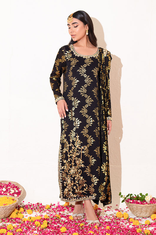 Zola is a gold sequined black base fabric made in pure chiffon cut in a drape style dress with a heavily embellished shirt on the left and work all over the chaks and neckline and sleeves of the dress. There is a motif on the shoulders of the dress as well that matches the work on the shirt. The look is completed by adding tassels on the ends of the dupatta. Comes with a black bosci silk pants.