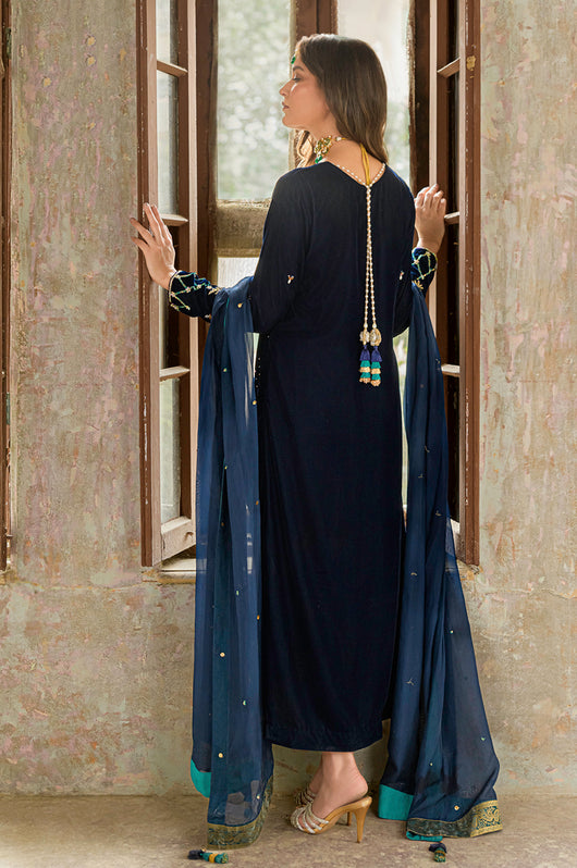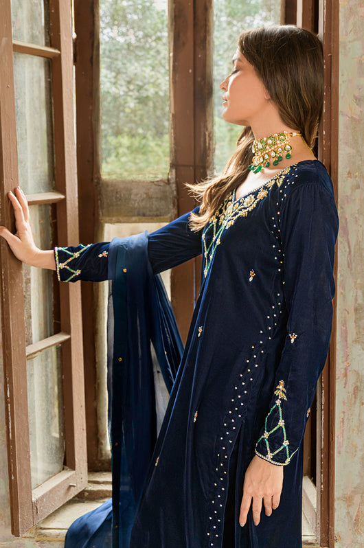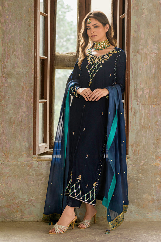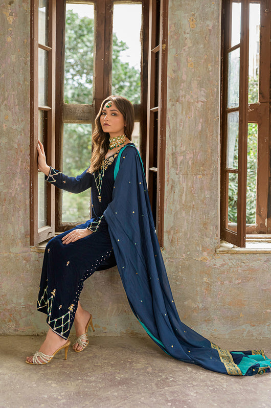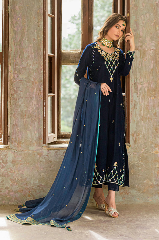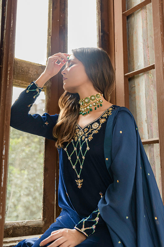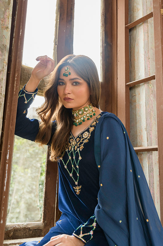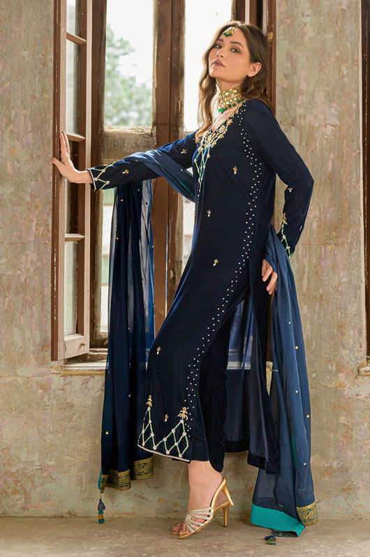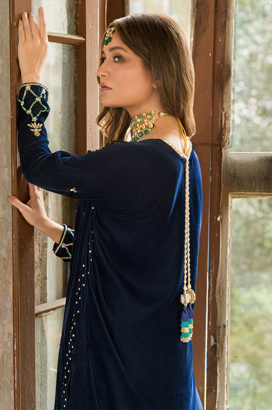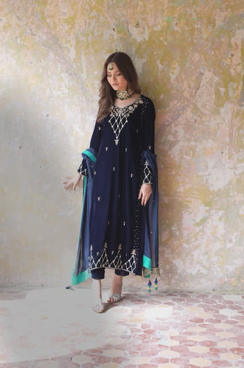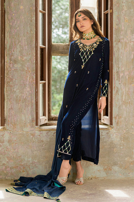 Zyna is a deep english blue canvas with notes of green and gold all over the shirt. Hand embellished with the finest material in kora, dabka, stones and sequins. Long straight shirt with heavily embellished neckline, sleeves and daman. The dress comes with straight velvet pants and a blue silk dupatta with heavy chan all over. The finishes are done in a contrasting green color to add a pop of color to the dress. Comes with tassel details on the back and dupatta. Length of the shirt is 48 inches. Custom length available by mentioning in additional notes when placing the order.